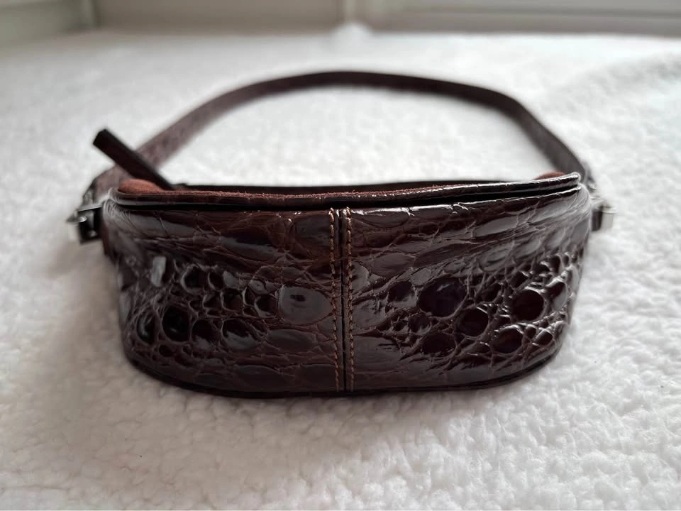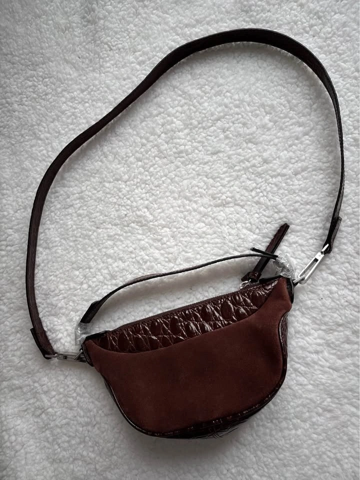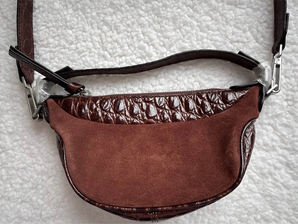 NEW BY FAR Mini Ami shoulder bag in sequoia brown crocodile-embossed leather and suede. Still has original wrapping.