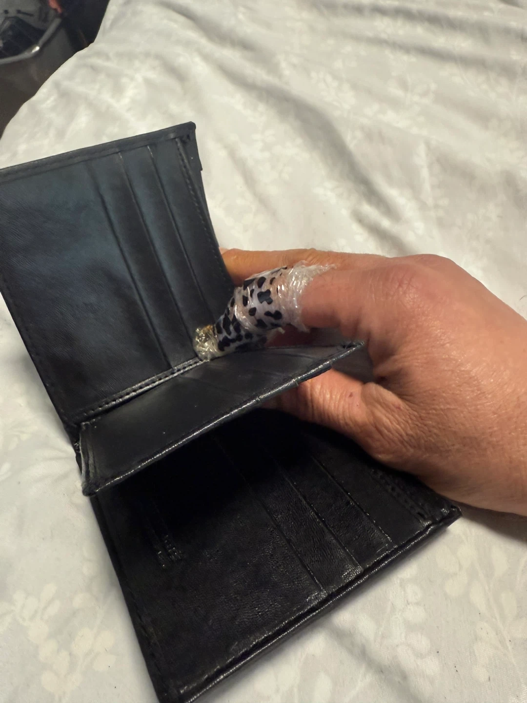 This is a Burberry bifold wallet. It's black leather with the signature Burberry plaid pattern. Plenty of card slots and compartments.