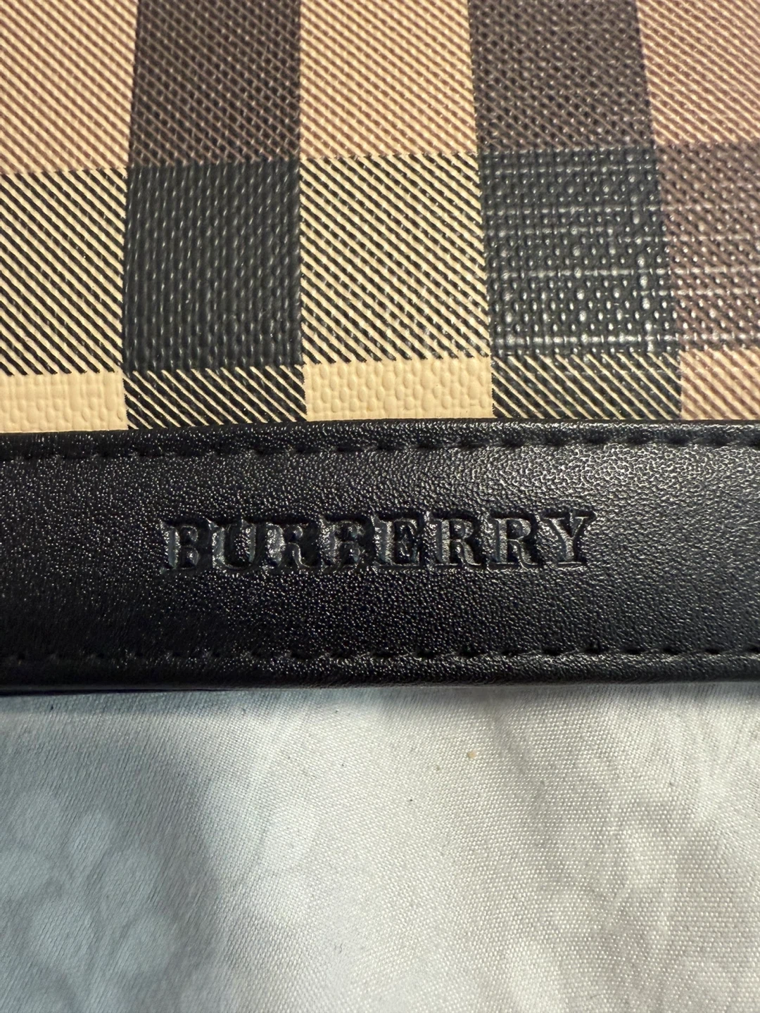 This is a Burberry bifold wallet. It's black leather with the signature Burberry plaid pattern. Plenty of card slots and compartments.