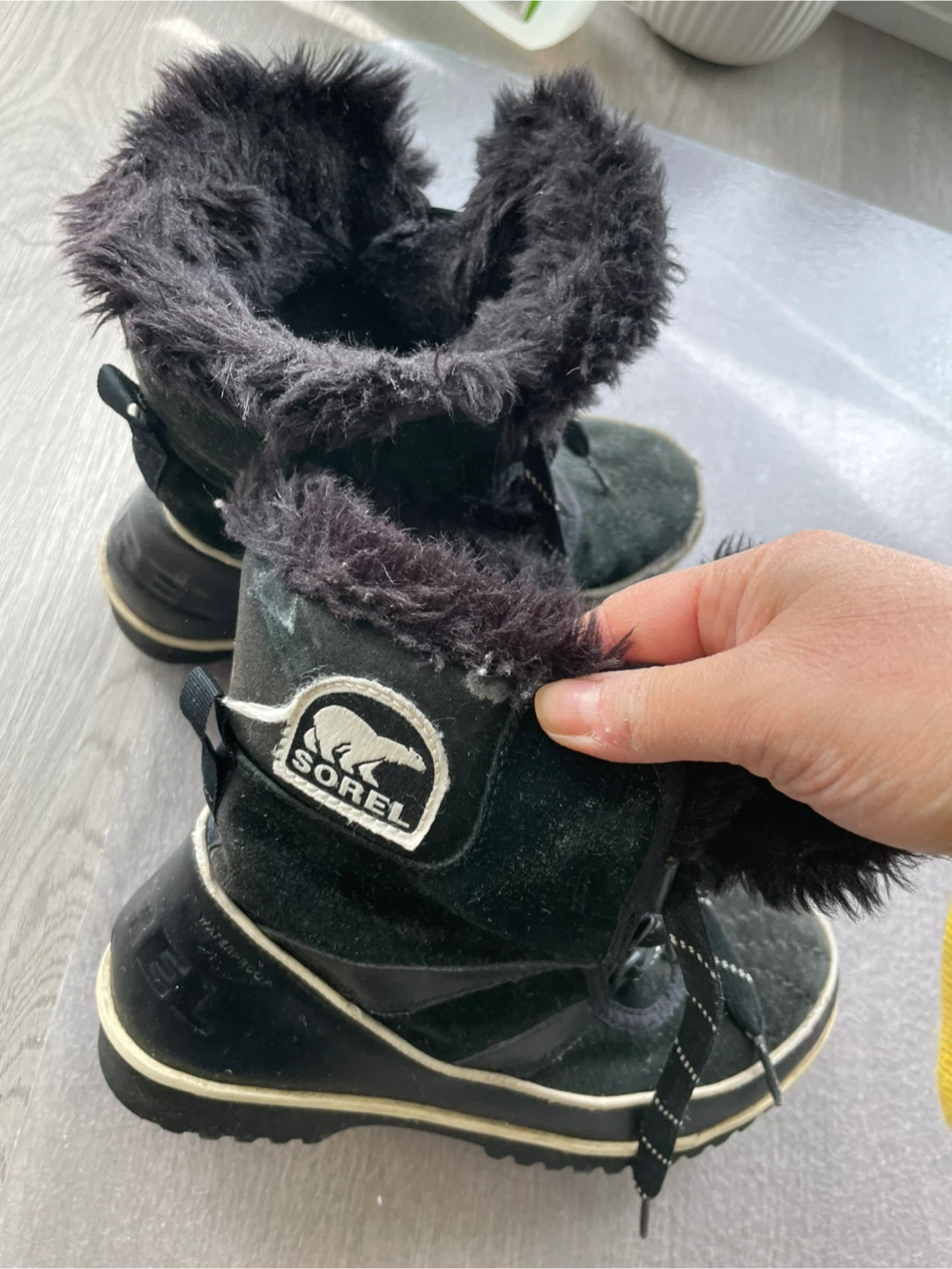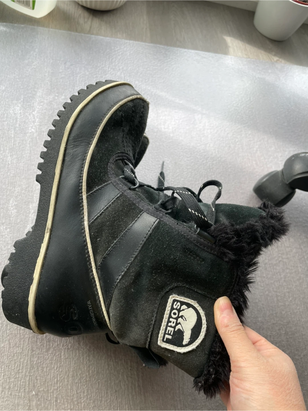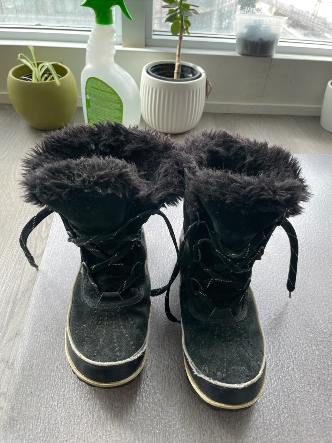 Black Sorel winter boots with faux fur lining. Lace-up closure for a snug fit. Great for cold and snowy weather!