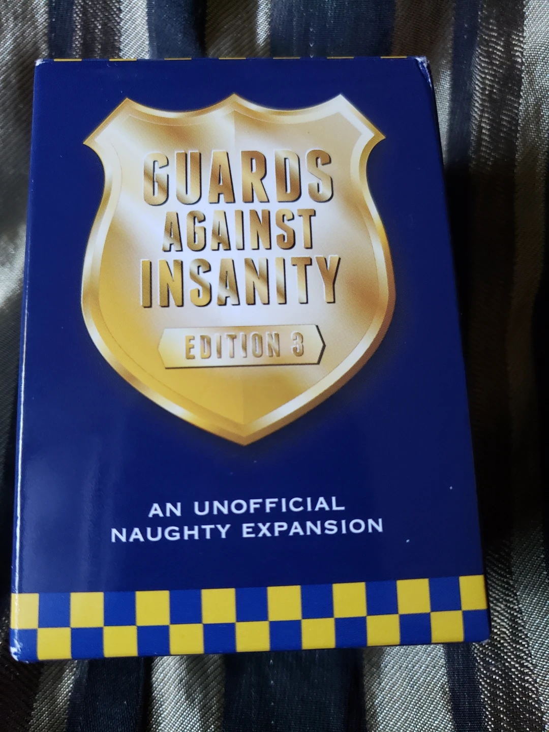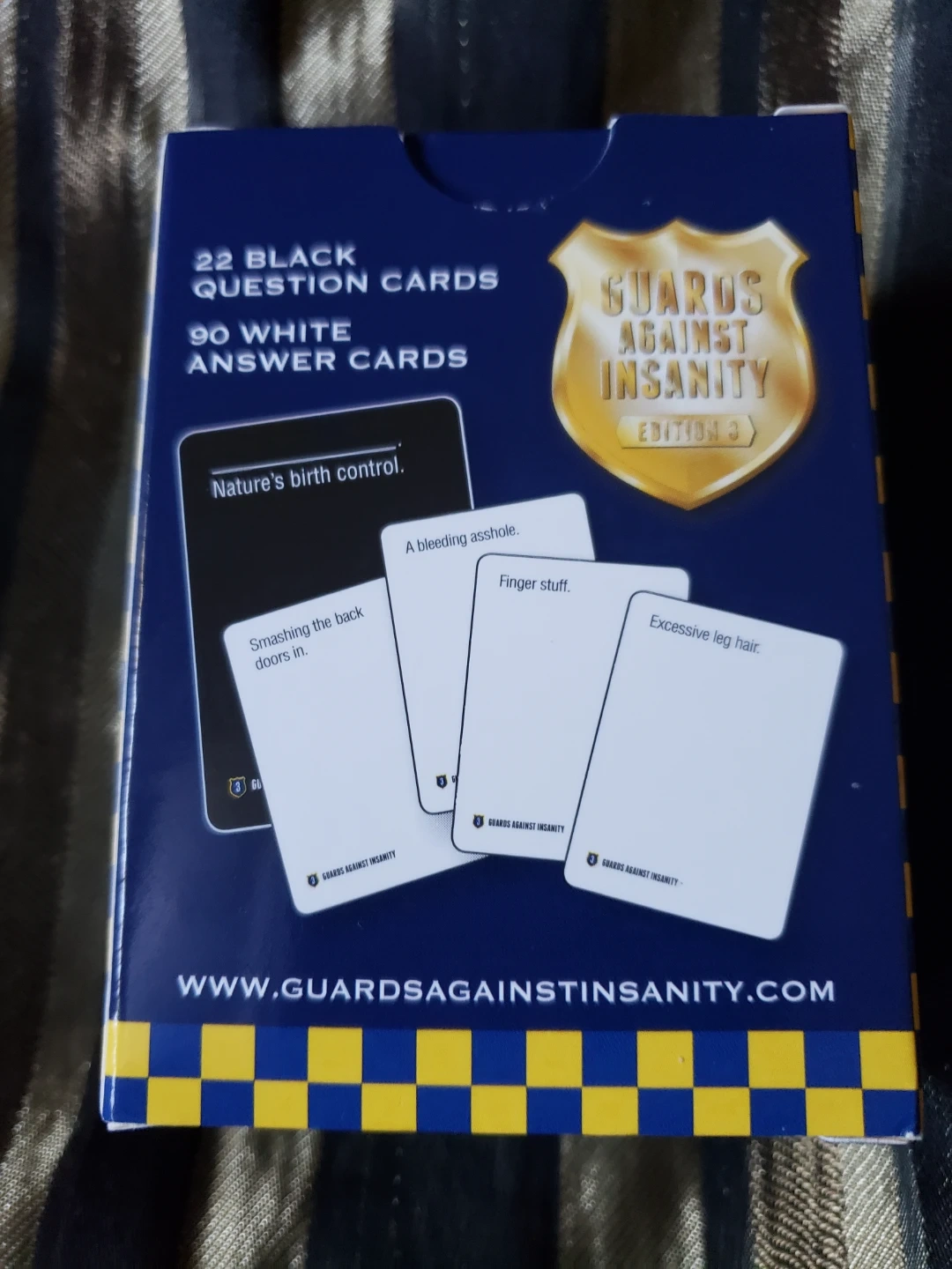 This is Guards Against Insanity Edition 3, an unofficial naughty expansion. It includes 22 black question cards and 90 white answer cards. Fun for game nights with friends!