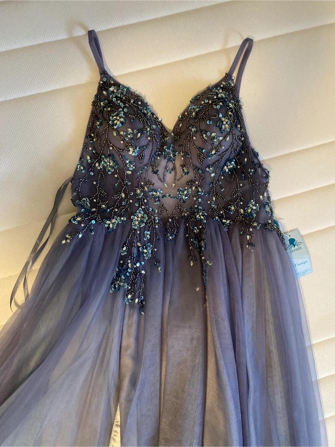 This is a beautiful ZAPAKA prom dress with spaghetti straps. It features intricate beading on the bodice and a flowy tulle skirt with a high slit. Perfect for special occasions! Size 2