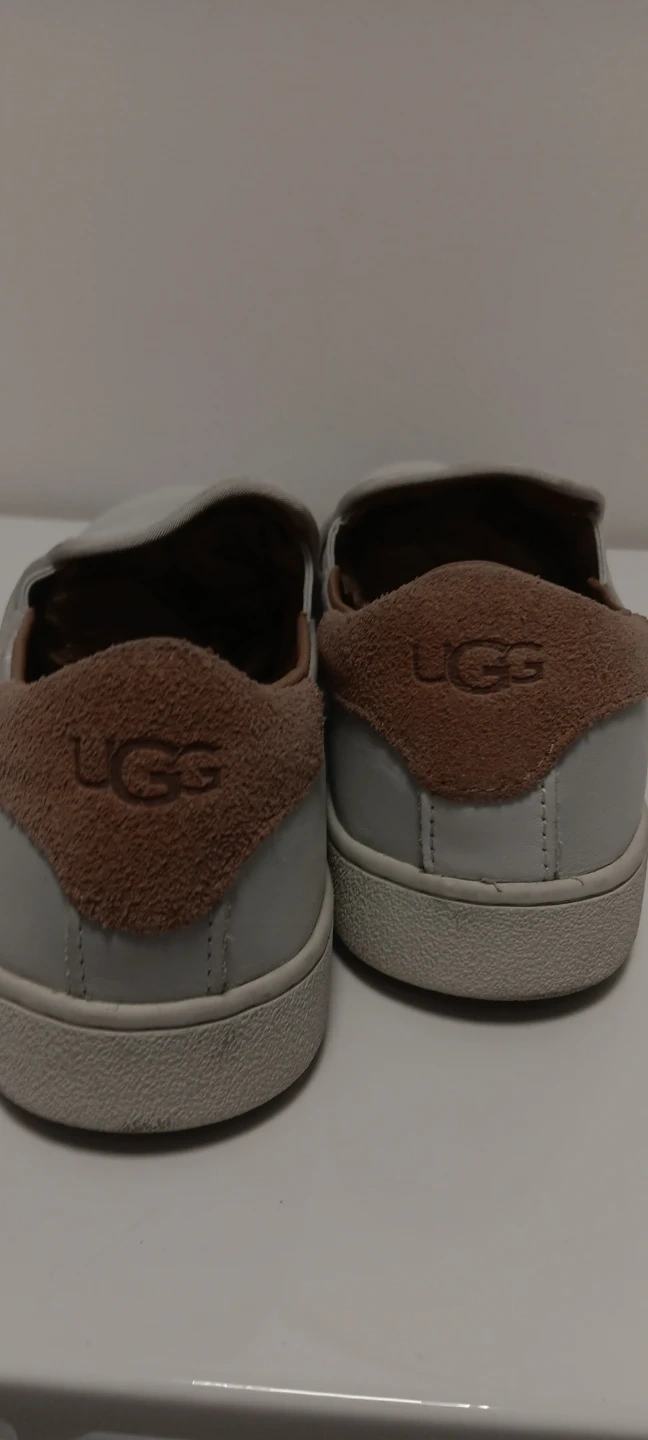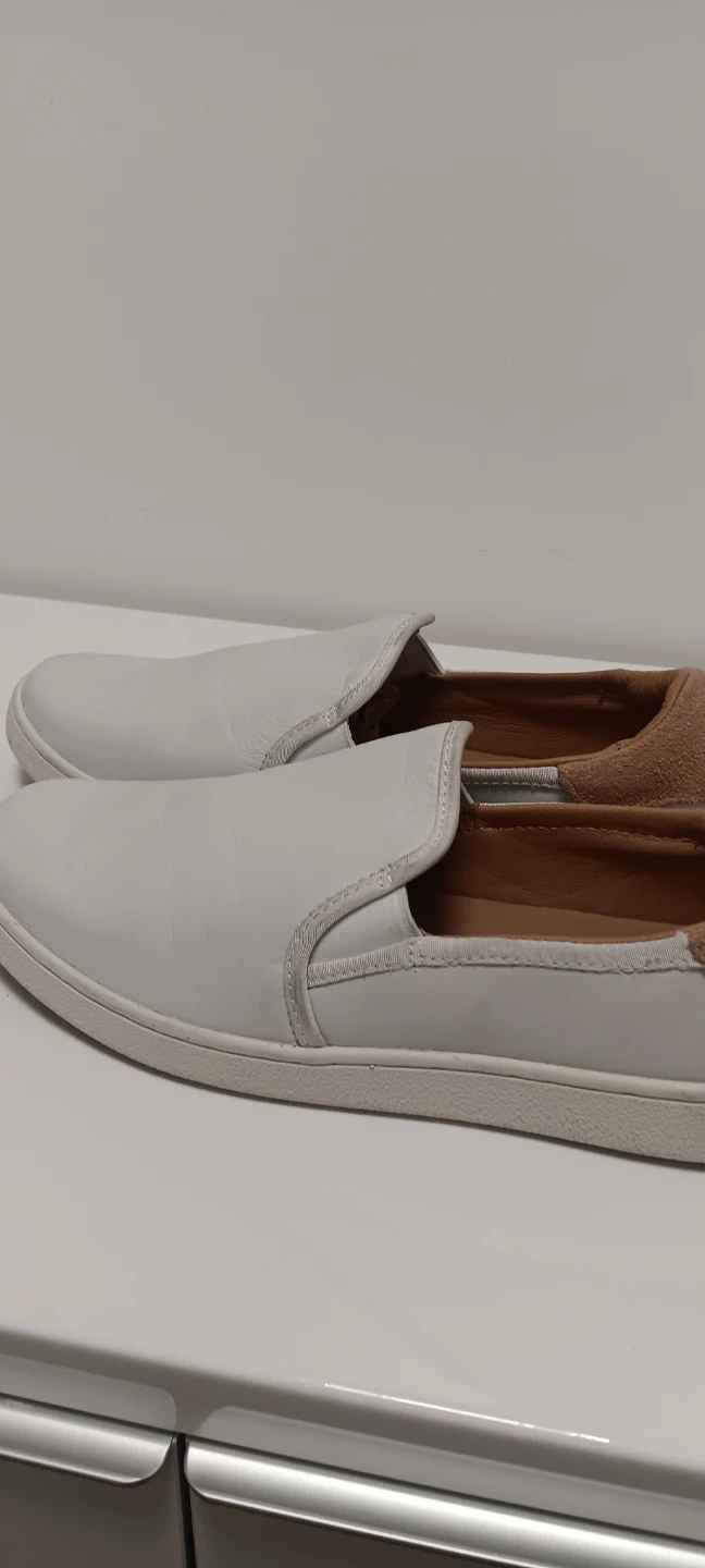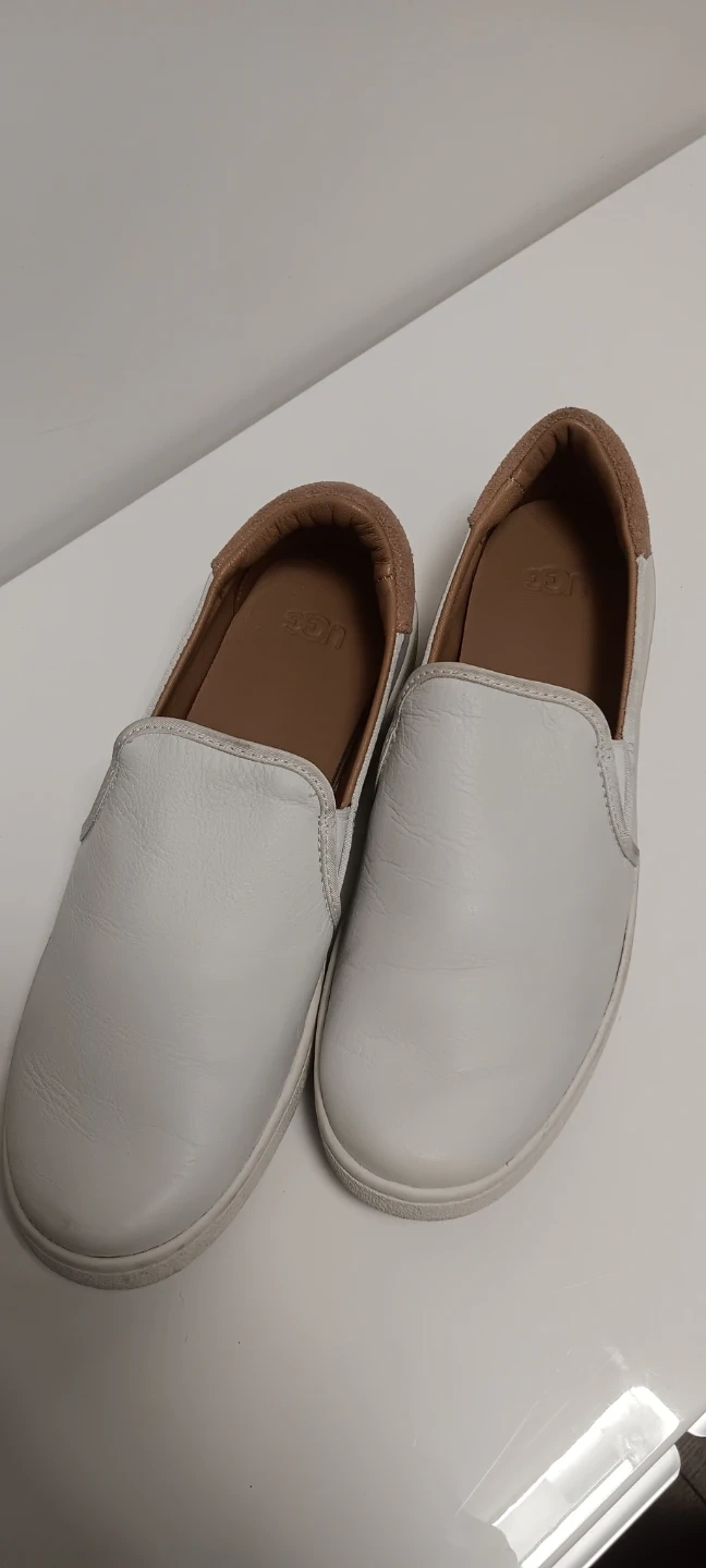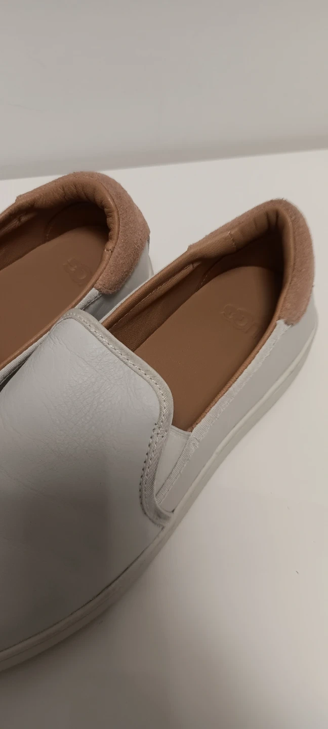 White leather slip-on shoes from UGG. Tan suede accent on the heel and collar. Leather interior.