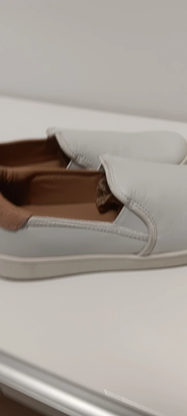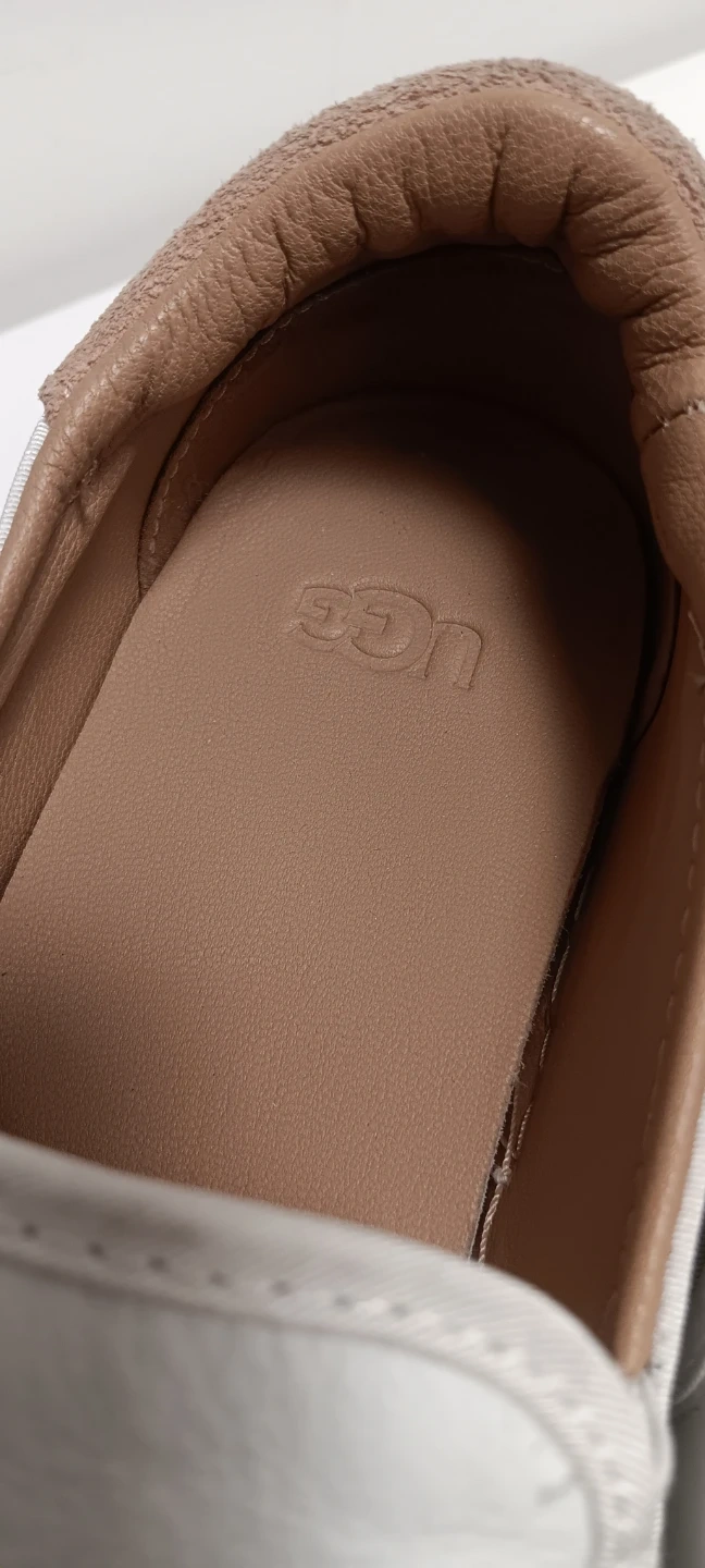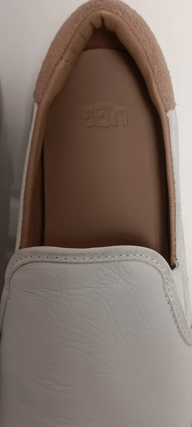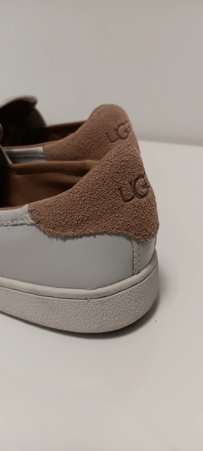 White leather slip-on shoes from UGG. Tan suede accent on the heel and collar. Leather interior.