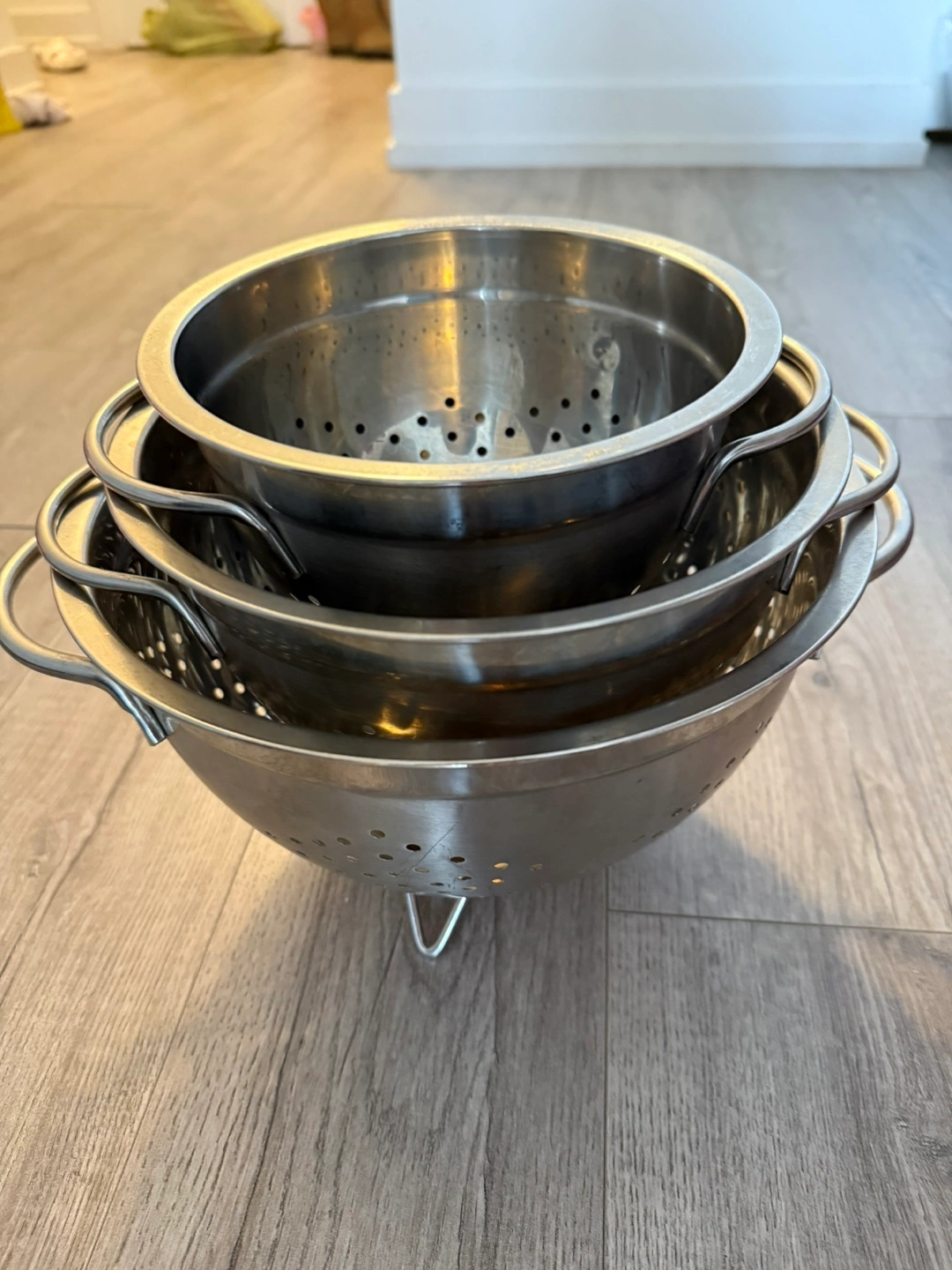 Set of three stainless steel colanders. They come in various sizes with side handles and feet. Perfect for draining pasta or washing vegetables! Pick up by the Eaton Center, $3