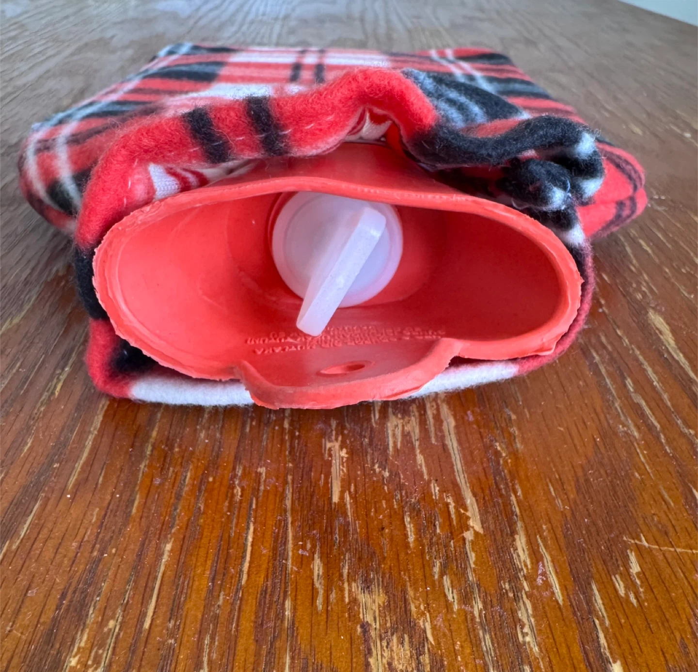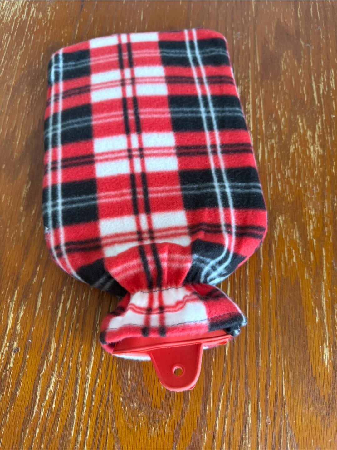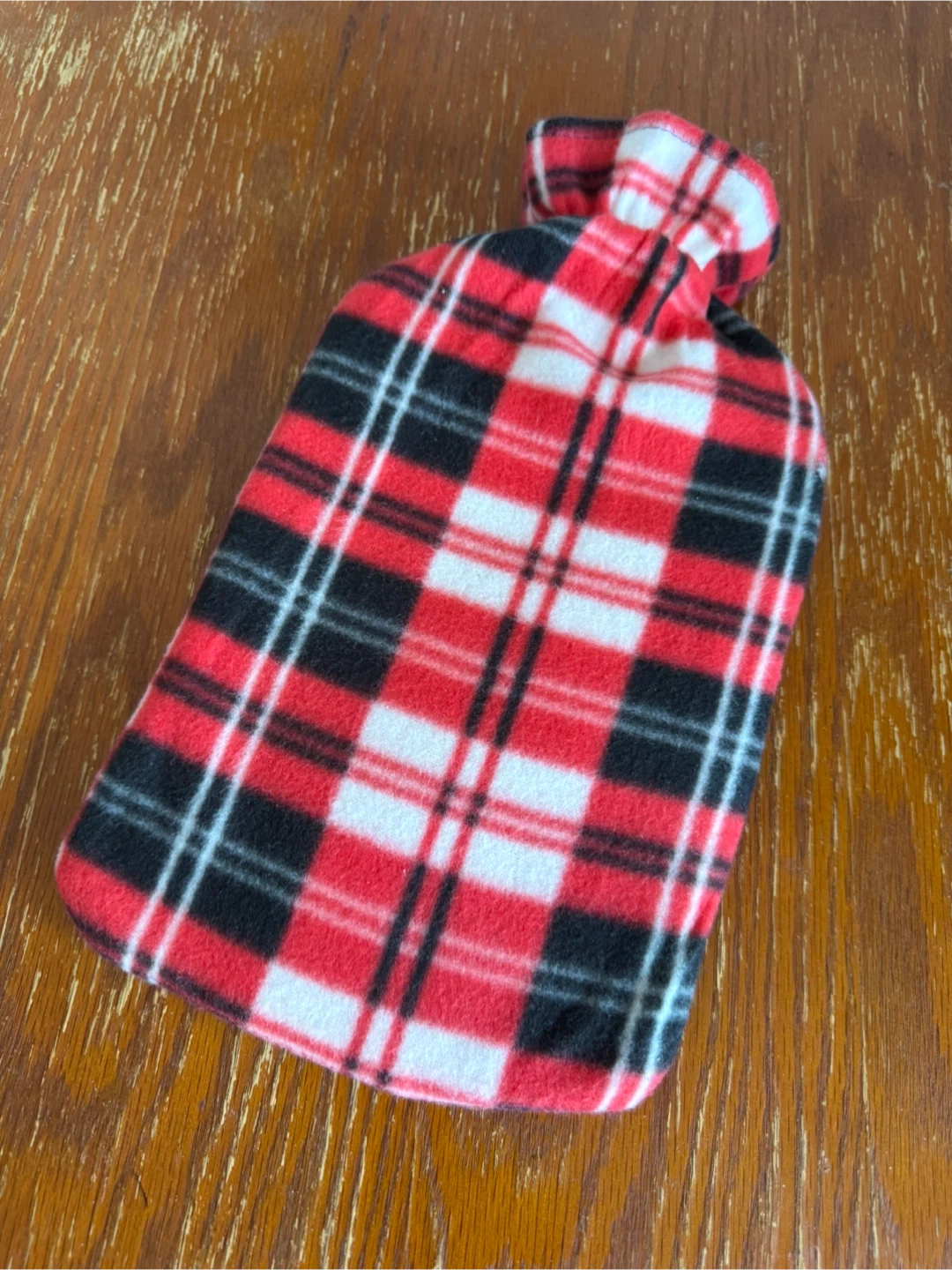Warm up with this cozy hot water bottle. It features a red, black, and white plaid fleece cover for extra comfort. The inner bag is made of durable rubber.