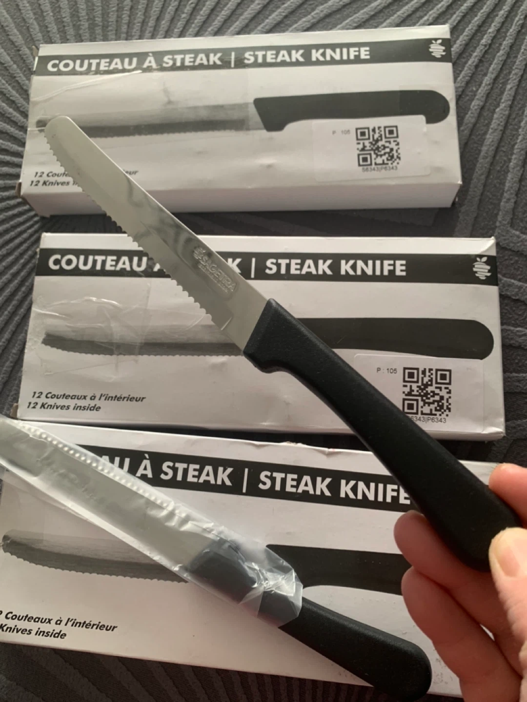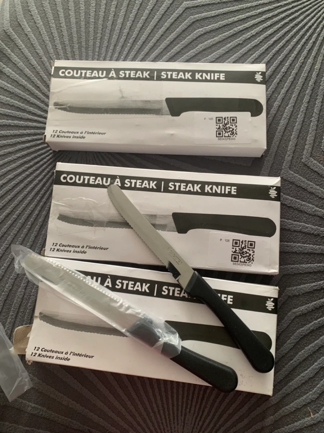 Set of 12 steak knives with serrated blades and black handles. These knives come in their original packaging. They're great for any dinner party or family meal!