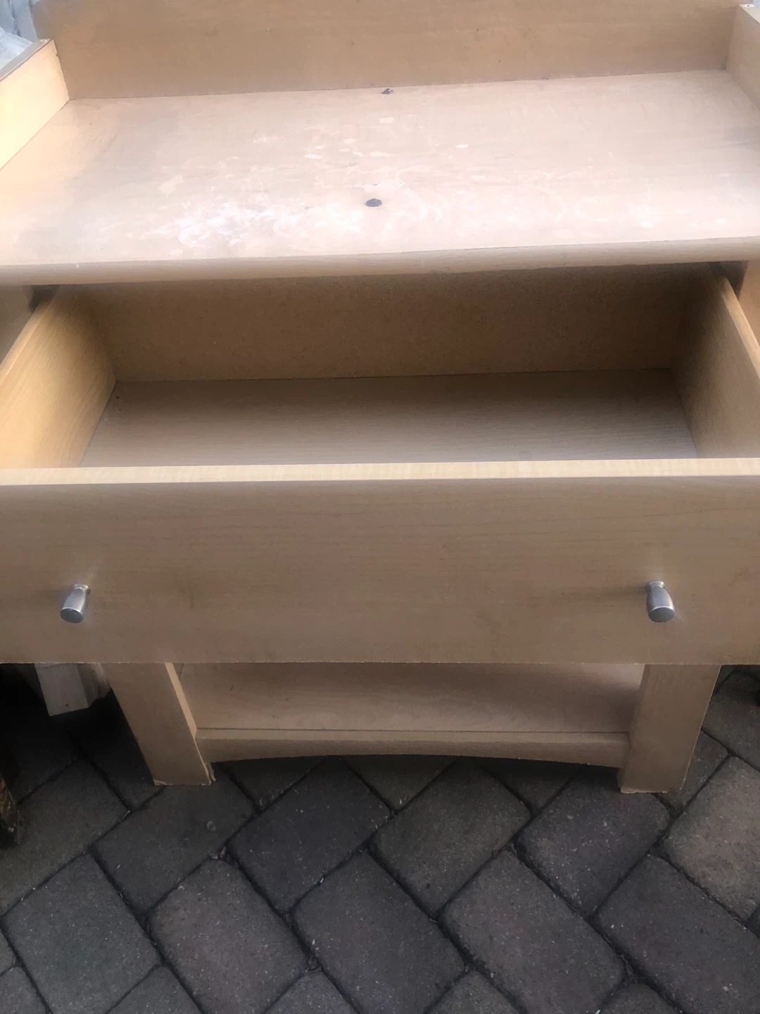 This is a wooden changing table. It has one drawer and two open shelves for storage. The surface has some light scuffs and marks. Made of wood composite.