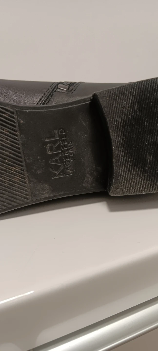 These are black leather ankle boots from Karl Lagerfeld. They feature a side zipper with a branded pull tab. The boots have a pointed toe and a low heel.