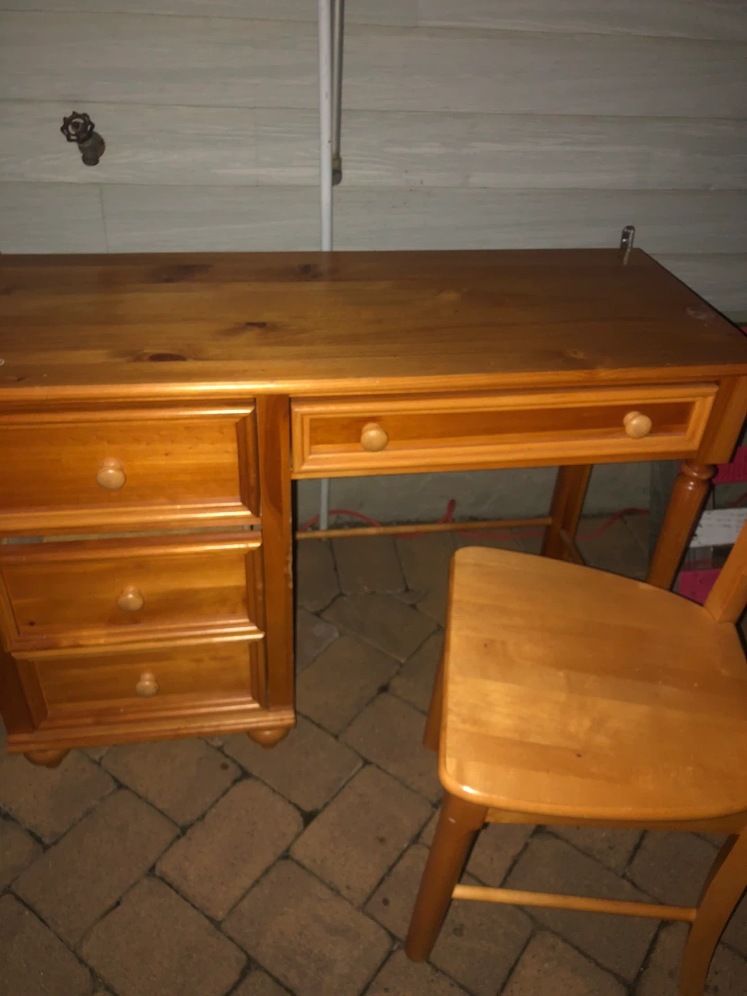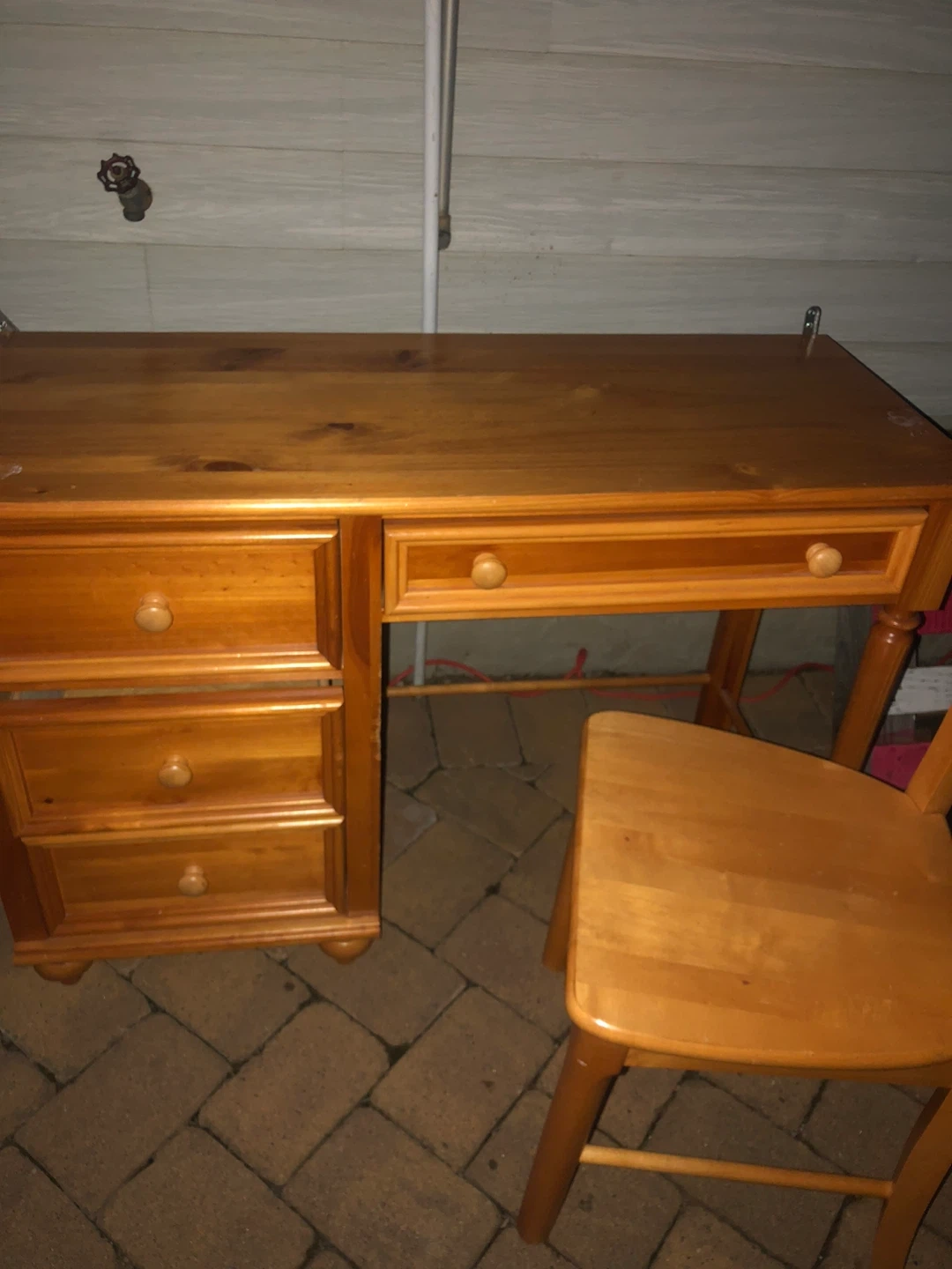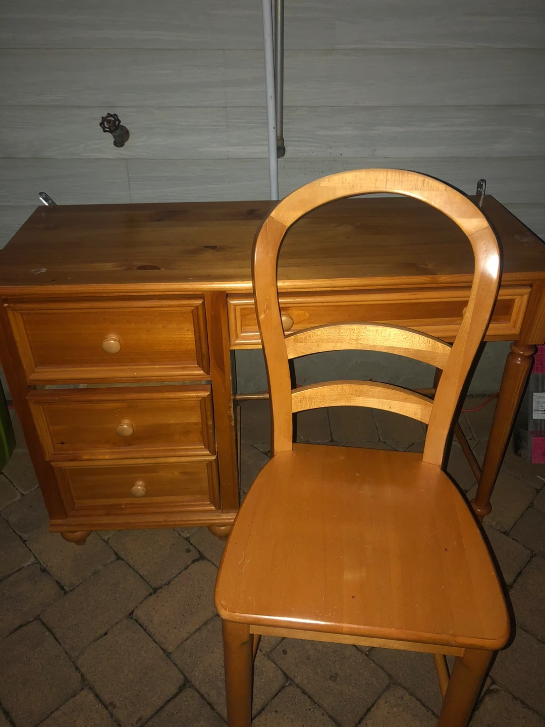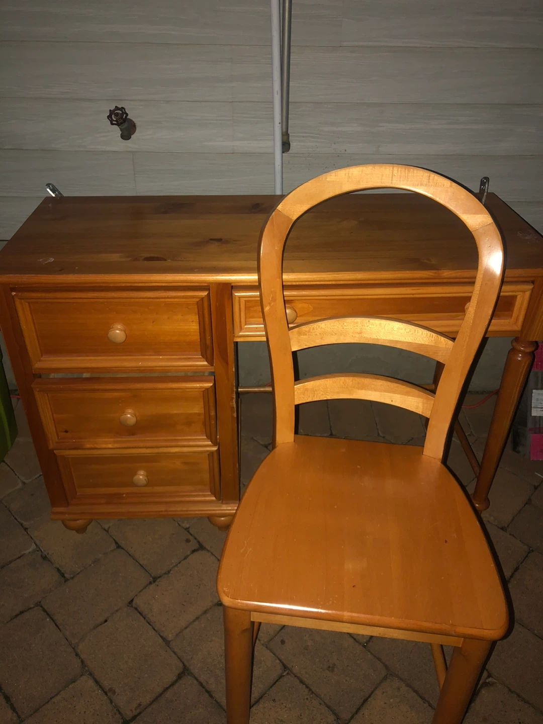 This is a solid wood desk with drawers and a matching chair. The desk has a warm, natural wood finish. It's great for a home office or study area. The chair complements the desk's style.