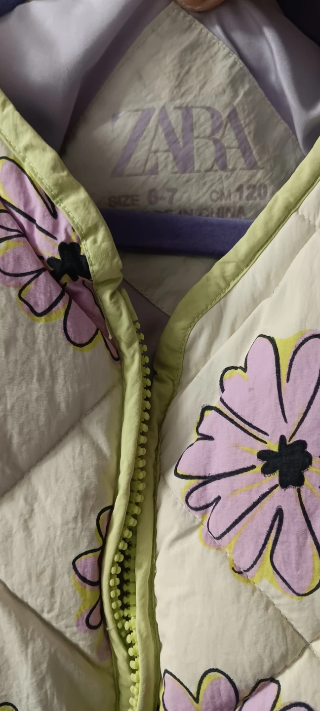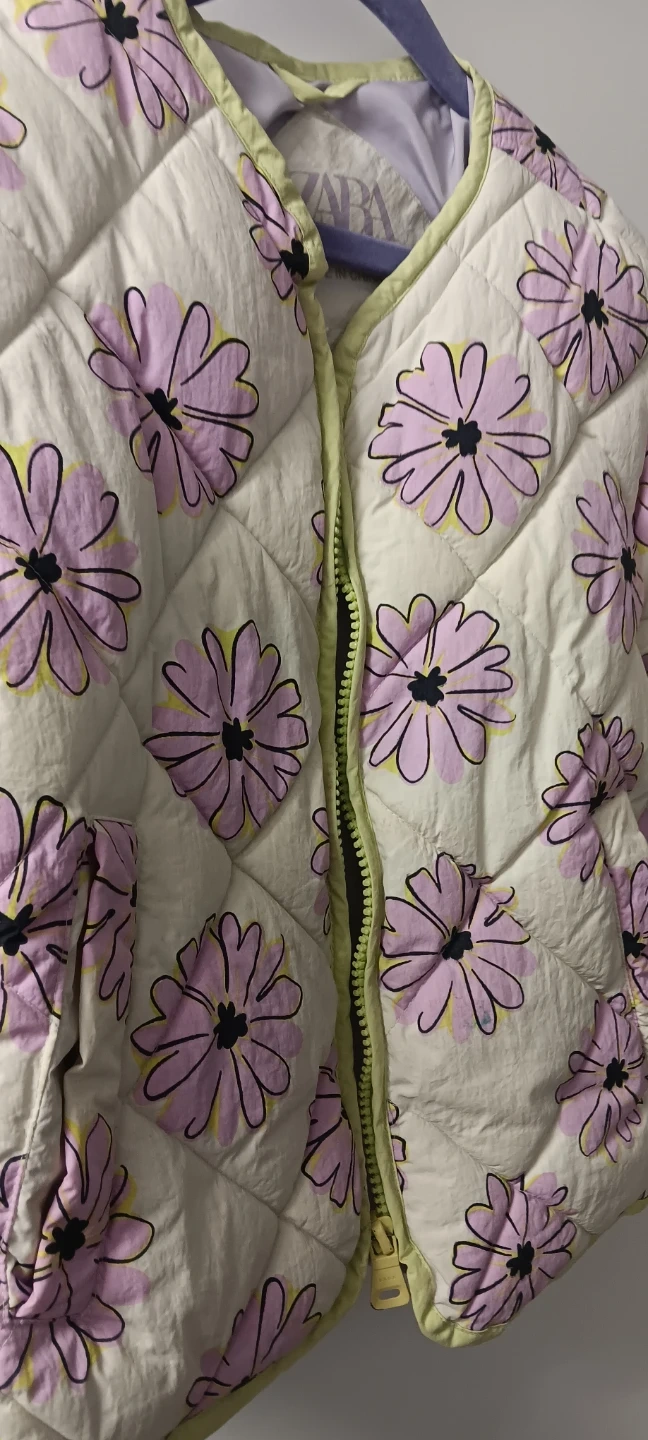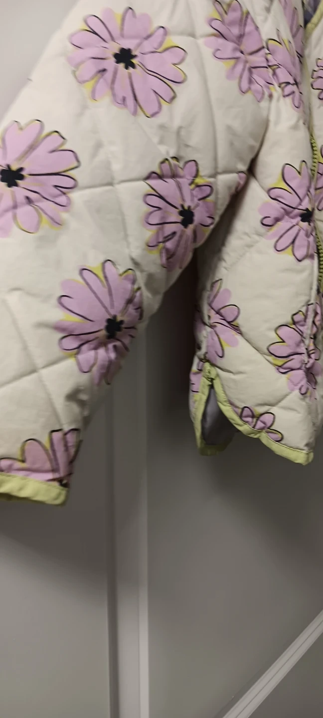 Quilted jacket by Zara featuring a cream base with a fun pink and yellow floral pattern. It's a size 6-7 years (CN 120). Perfect for layering during cooler weather!