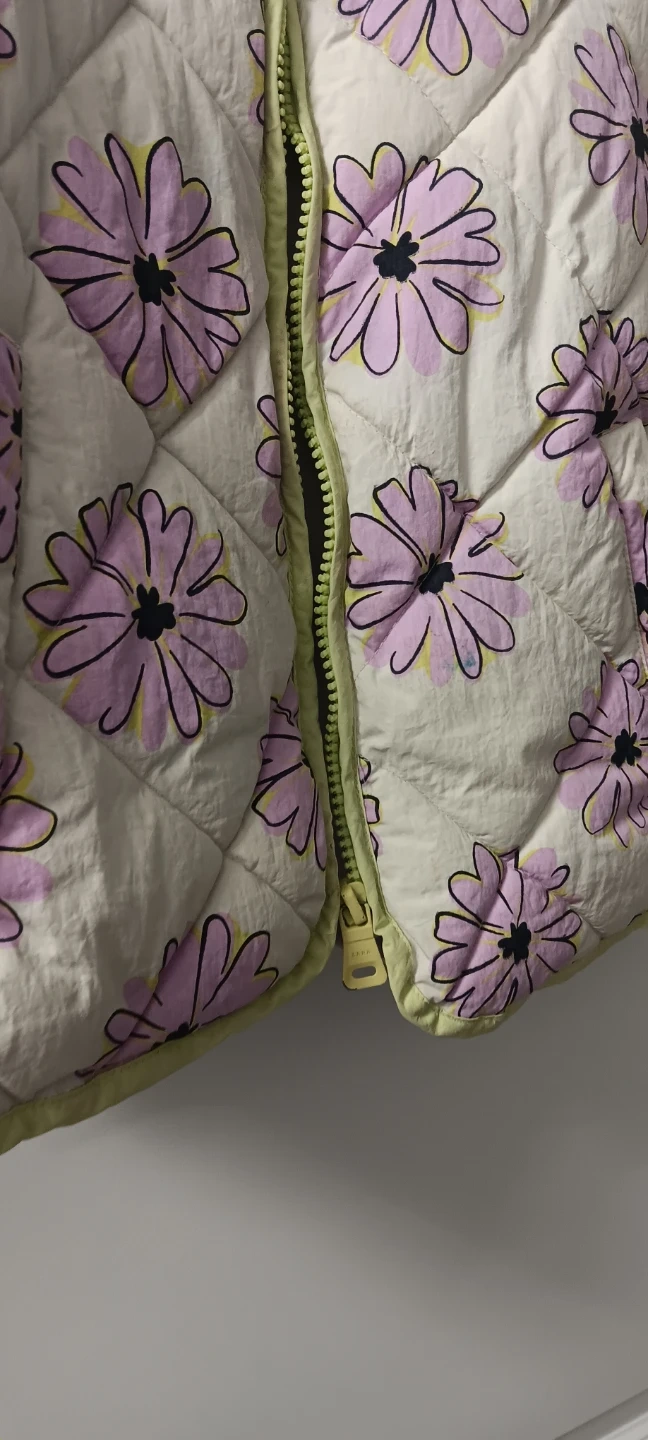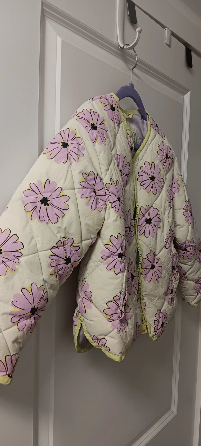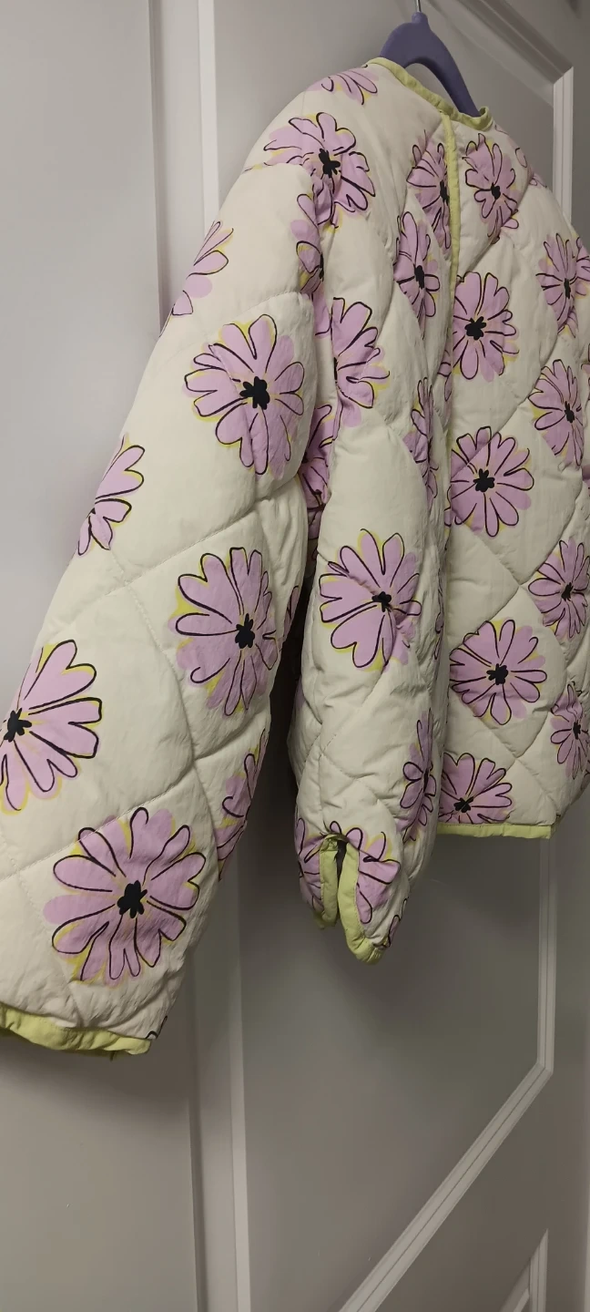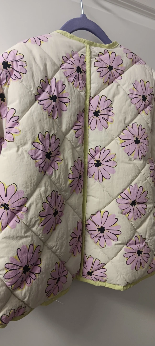 Quilted jacket by Zara featuring a cream base with a fun pink and yellow floral pattern. It's a size 6-7 years (CN 120). Perfect for layering during cooler weather!