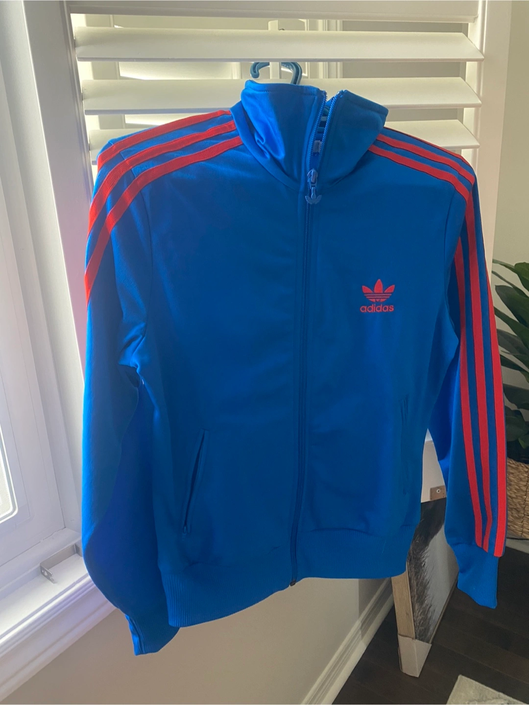 Women’s Royal blue Adidas track jacket with red stripes on the sleeves. It's a size S/P. Worn only once. Pick up in Maple