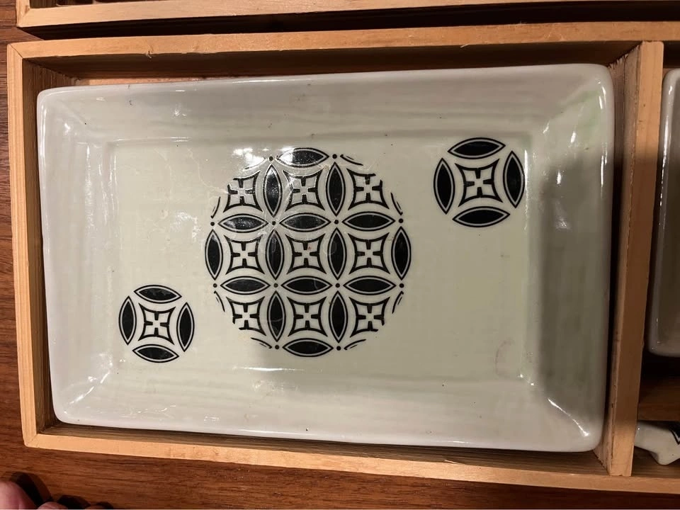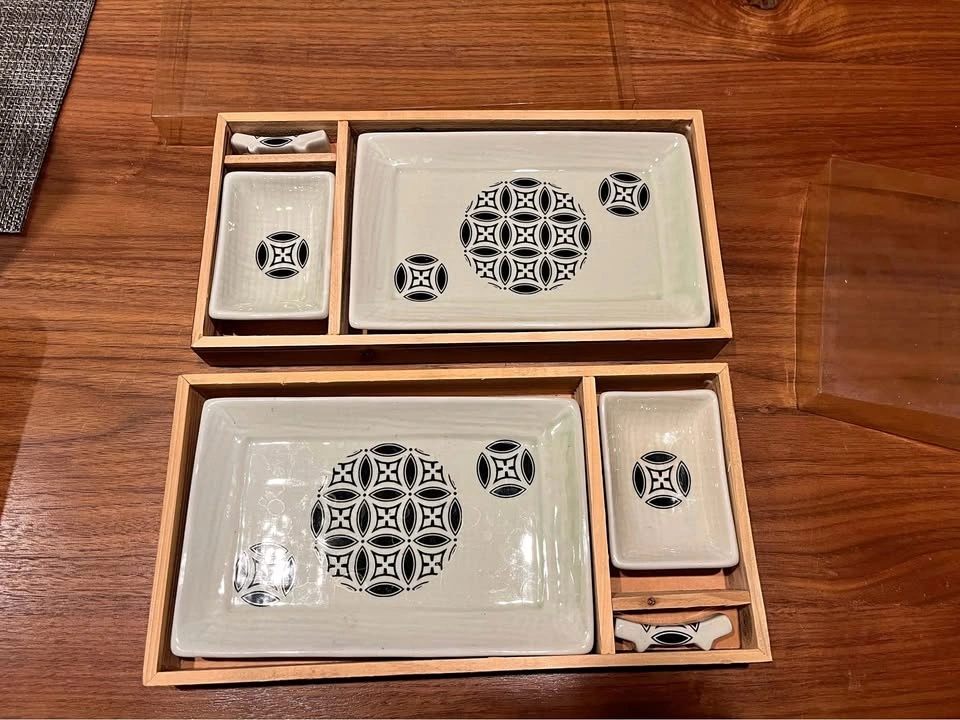 Set of two sushi plates, includes soy sauce dish and chopstick rest. Main dish is approx 8” x 5”. Used maybe once. No cracks, blemishes or defects. Comes in wooden box with clear plastic lid.
