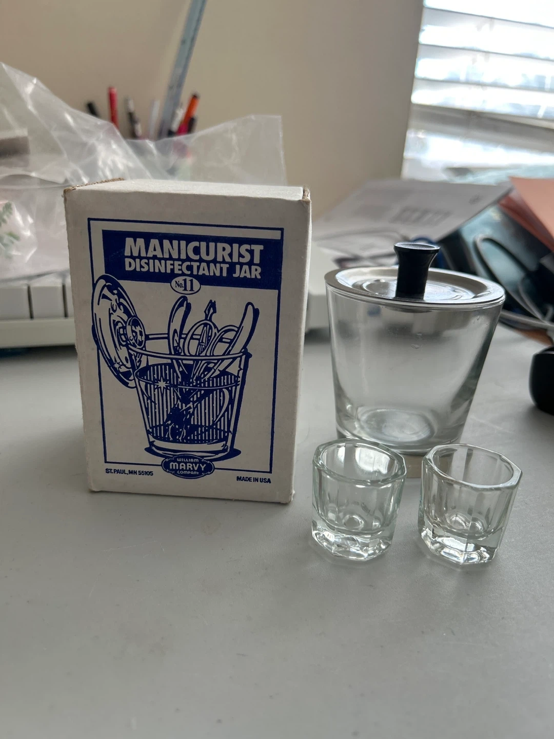 This is a glass disinfectant jar for manicurists. It includes the main jar with a lid and two smaller dipping cups. Made in the USA. Perfect for keeping nail tools clean!