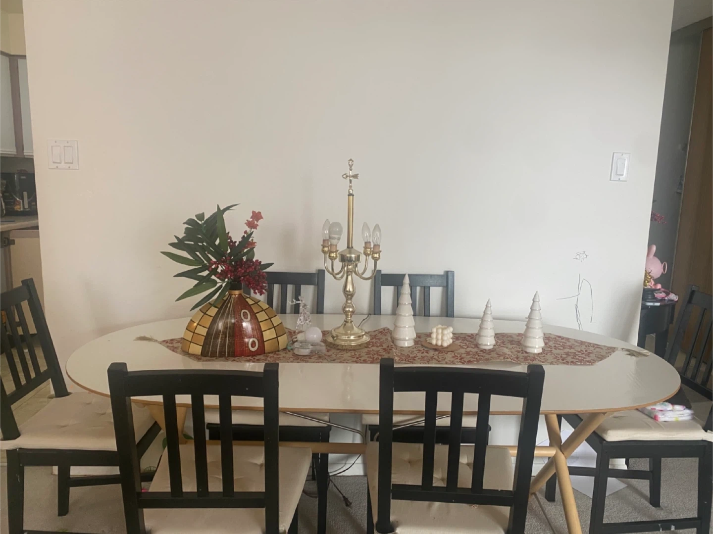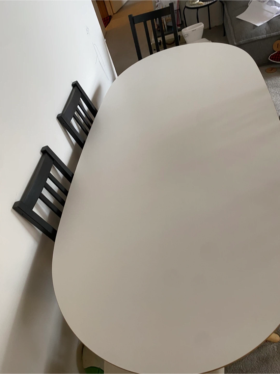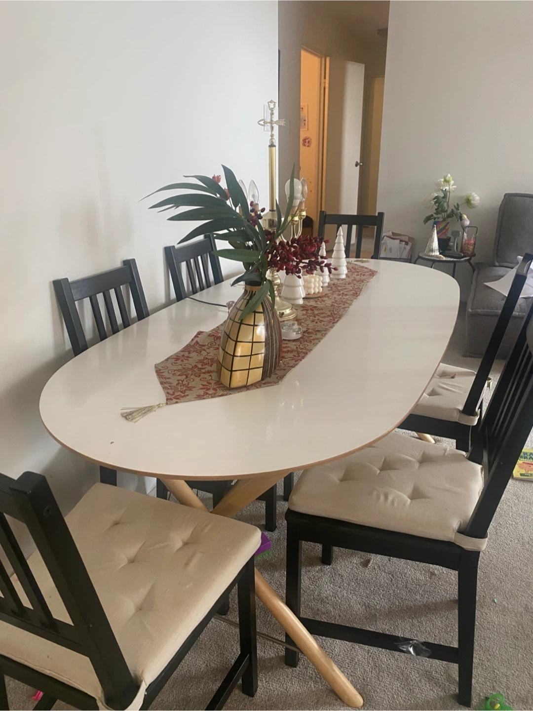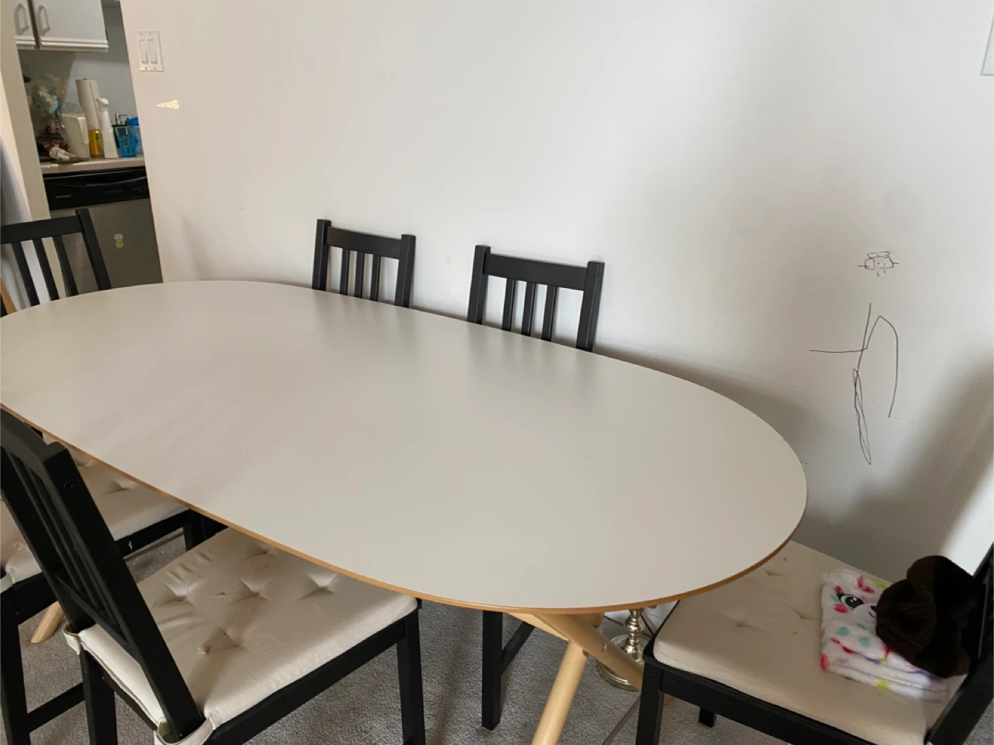 This is an oval dining table with six matching chairs. The table has a white top and a unique wooden base. The chairs are black with light beige upholstered seats. This set seats six people comfortably.