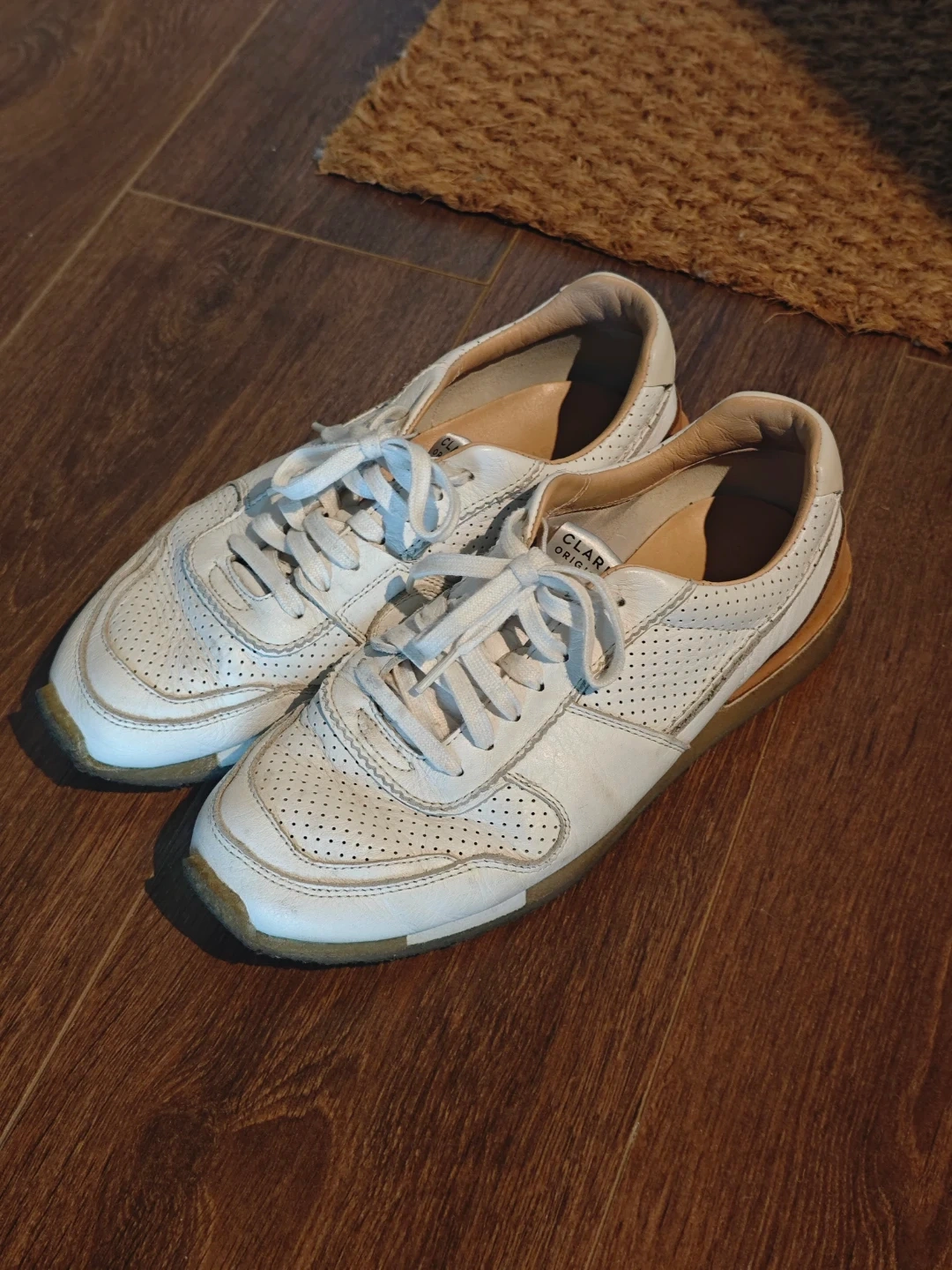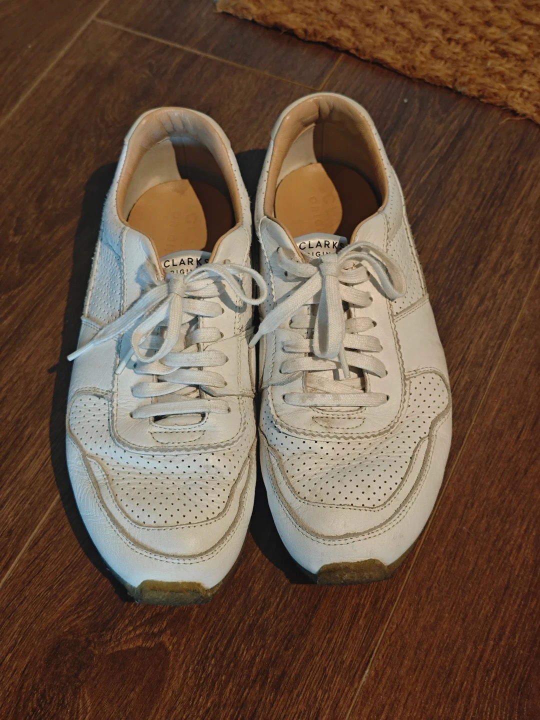 These white leather Clarks Originals Tor Runner sneakers feature perforated detailing. They have a classic lace-up closure and a durable sole. These shoes are great for casual wear.