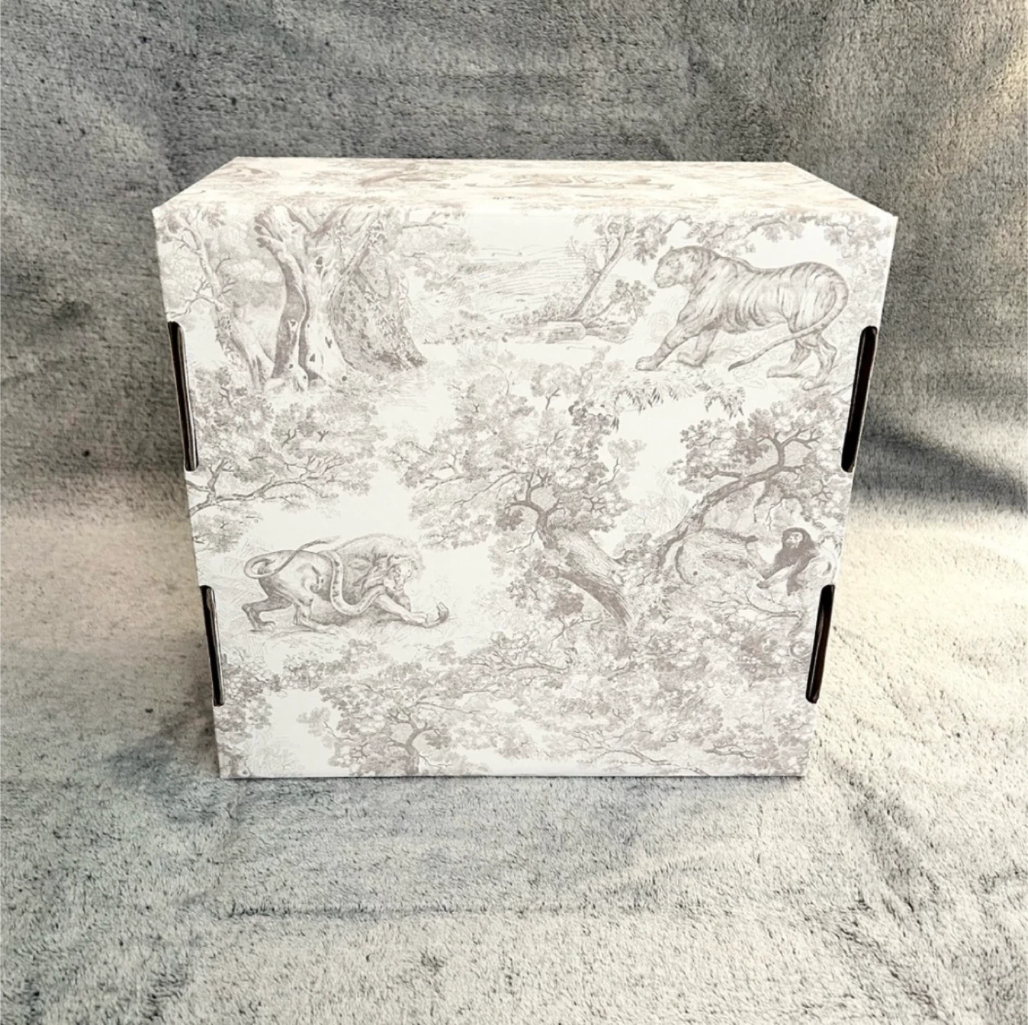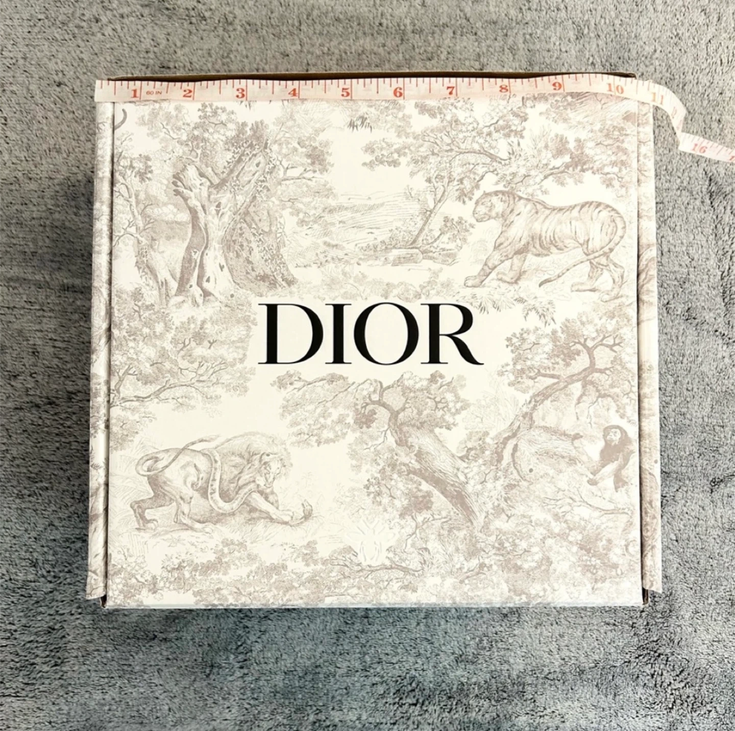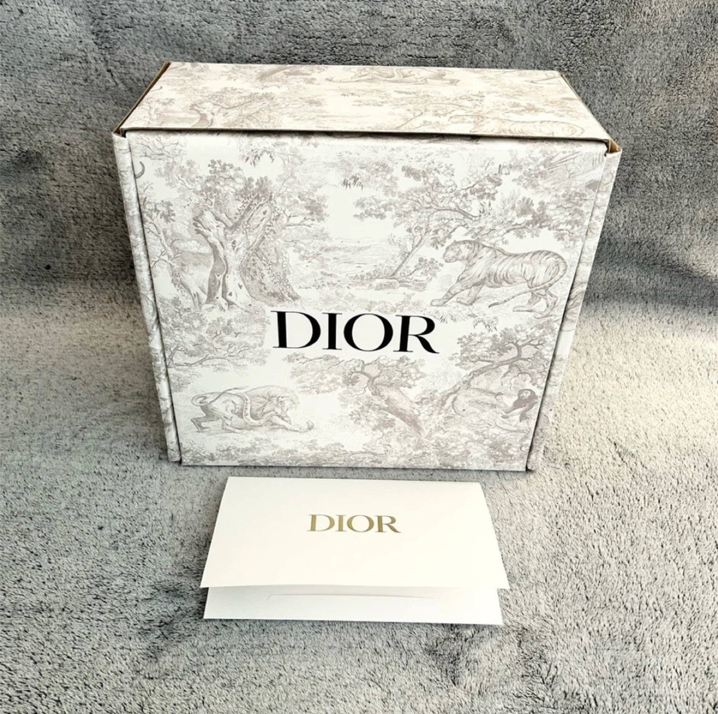 DIOR decorative box with lid. Features a toile de Jouy print with animals. Includes a DIOR card and shredded paper. Shipping box about 11 x 10 x 5 inches