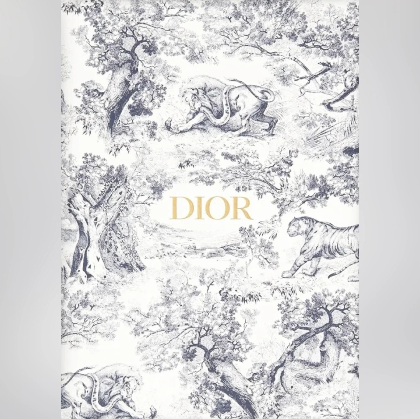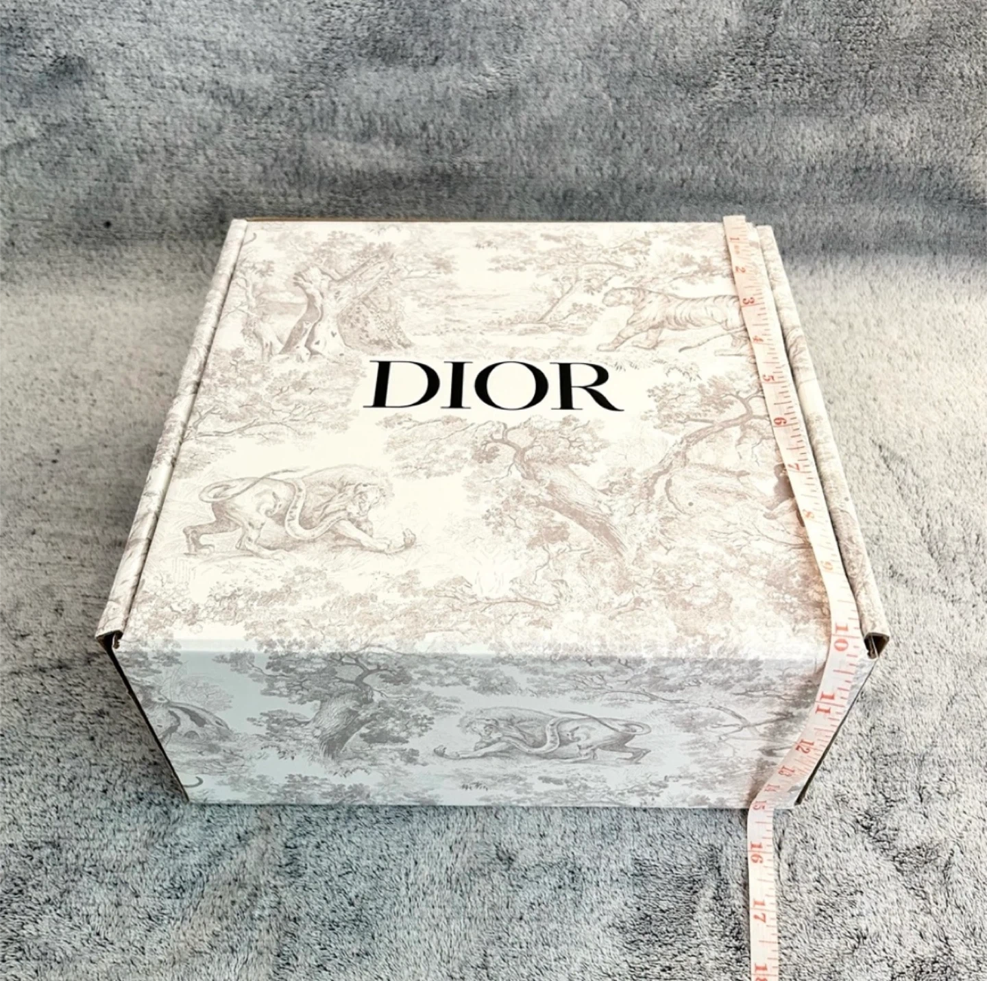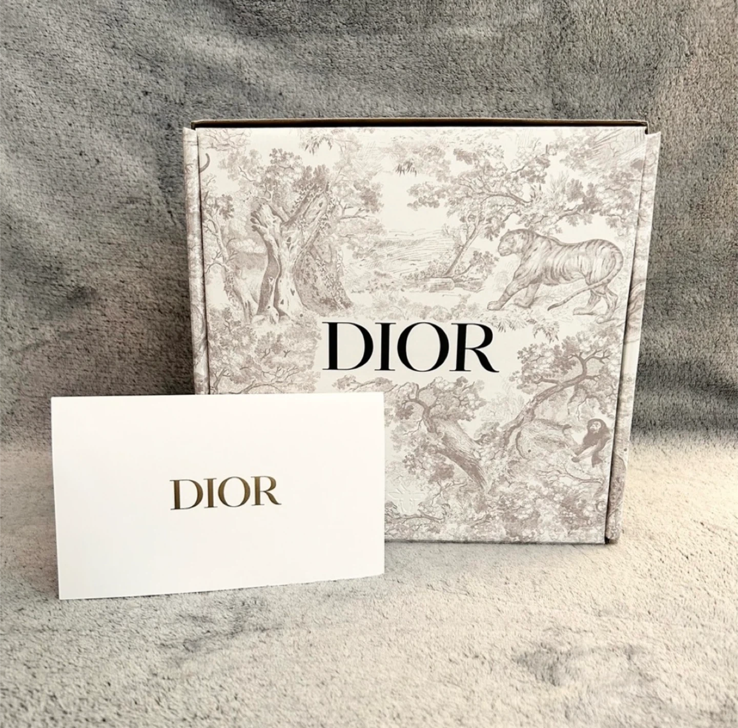 DIOR decorative box with lid. Features a toile de Jouy print with animals. Includes a DIOR card and shredded paper. Shipping box about 11 x 10 x 5 inches