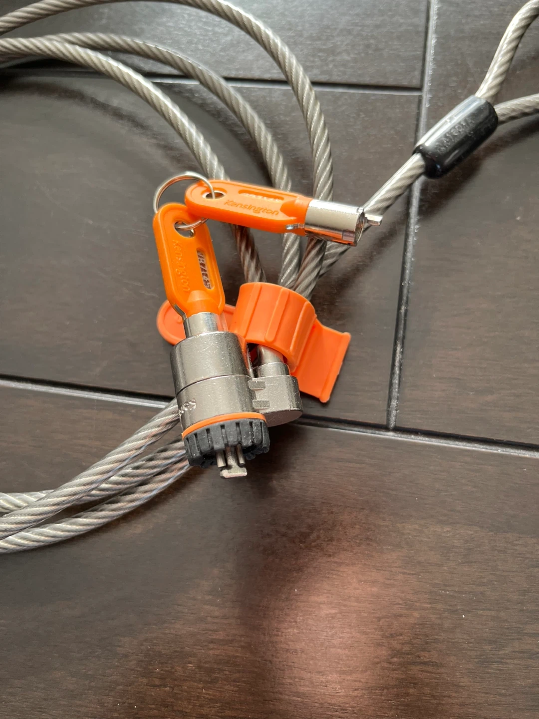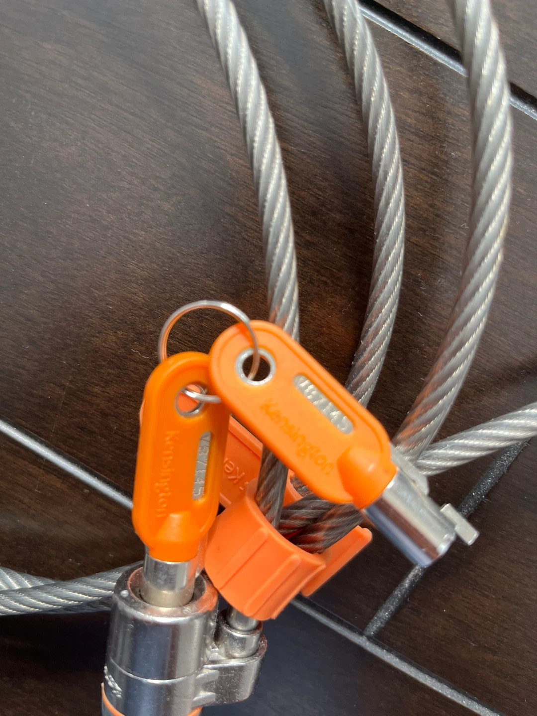 This is a Kensington cable lock with two keys. It's a braided steel cable lock for security. The lock mechanism is a combination lock.