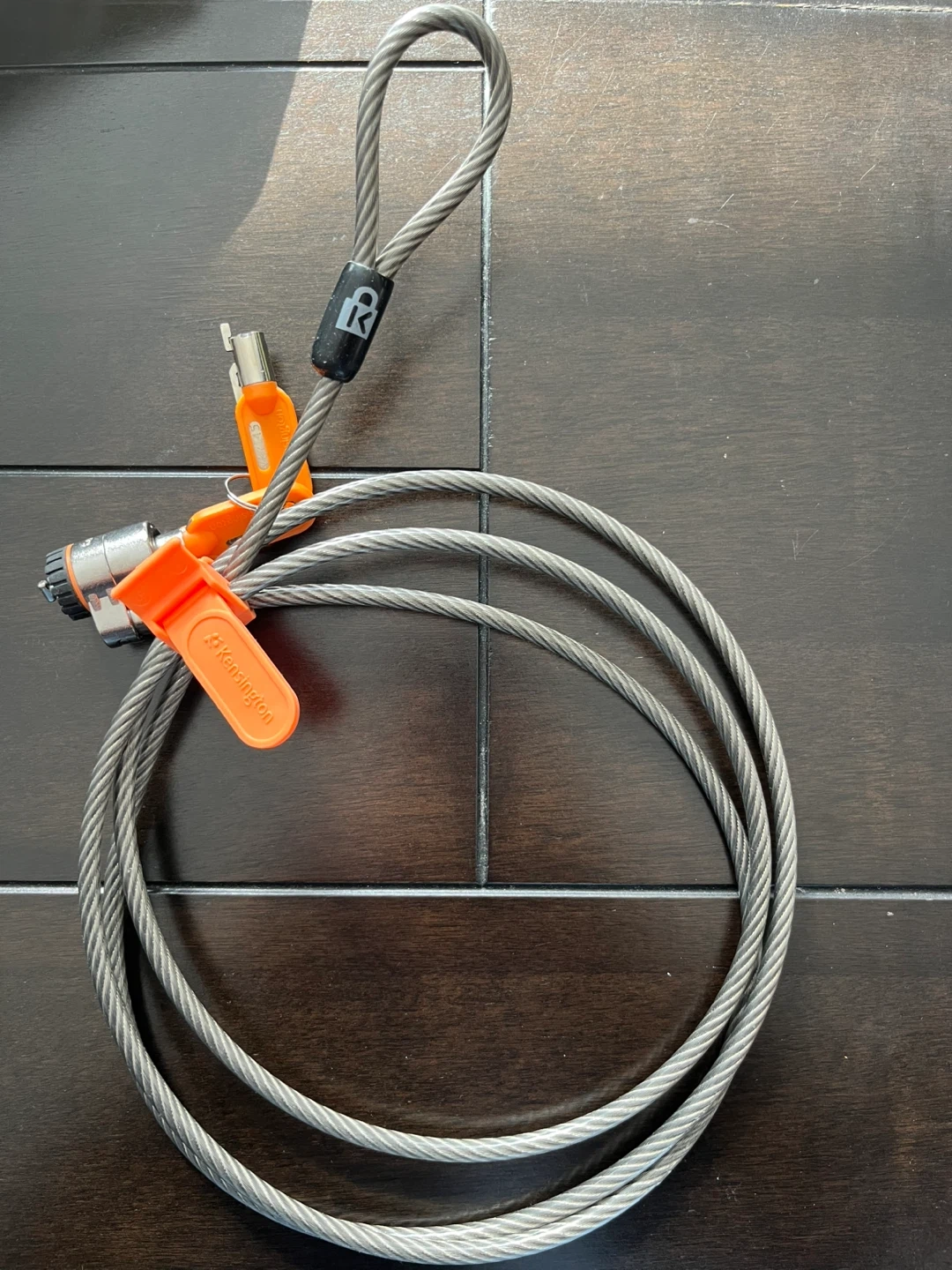 This is a Kensington cable lock with two keys. It's a braided steel cable lock for security. The lock mechanism is a combination lock.