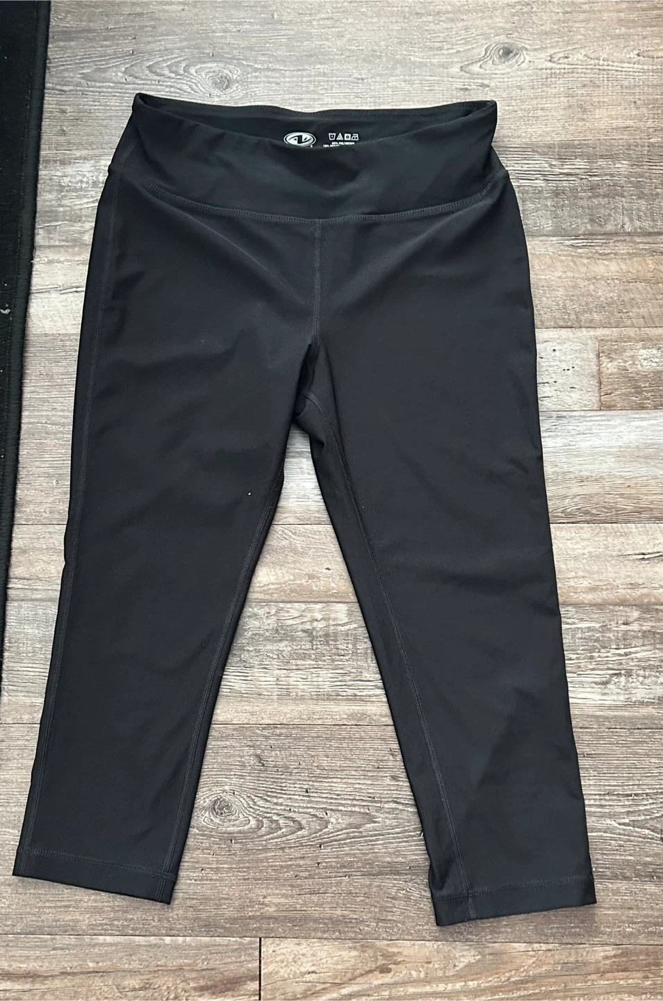 These black Athletic Works fitted crop pants are made of 85% polyester and 15% spandex. They're a size medium. They're great for workouts!