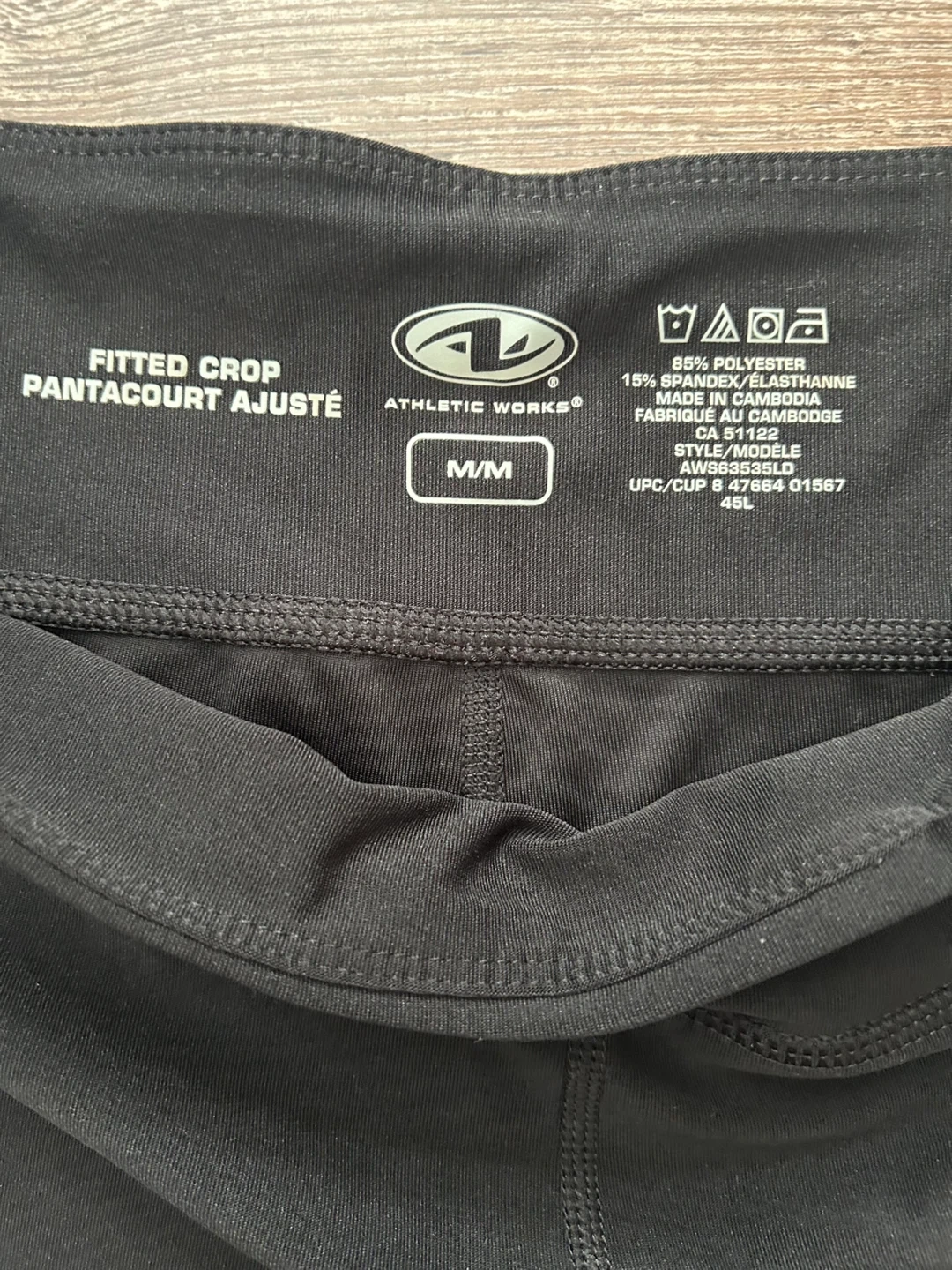 These black Athletic Works fitted crop pants are made of 85% polyester and 15% spandex. They're a size medium. They're great for workouts!