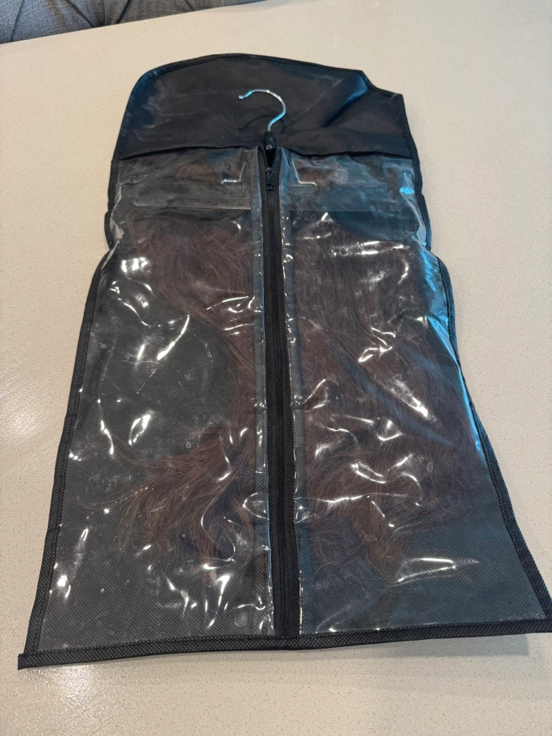 Set of clip-in hair extensions in a natural brown shade. These extensions come with securely attached clips for easy application. Includes a storage bag.