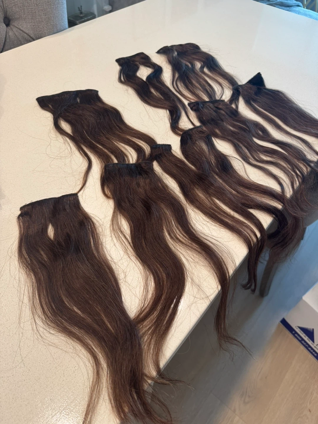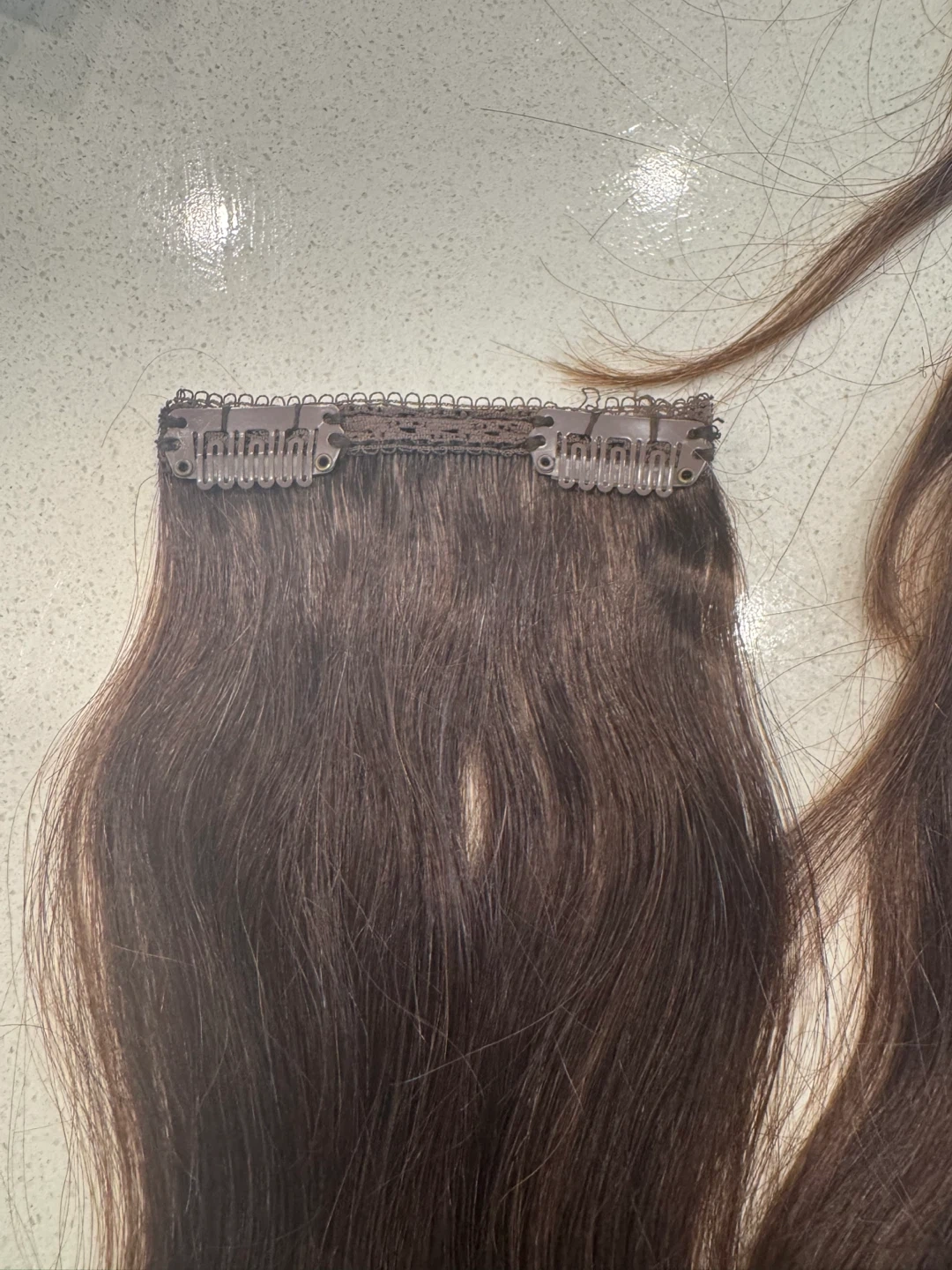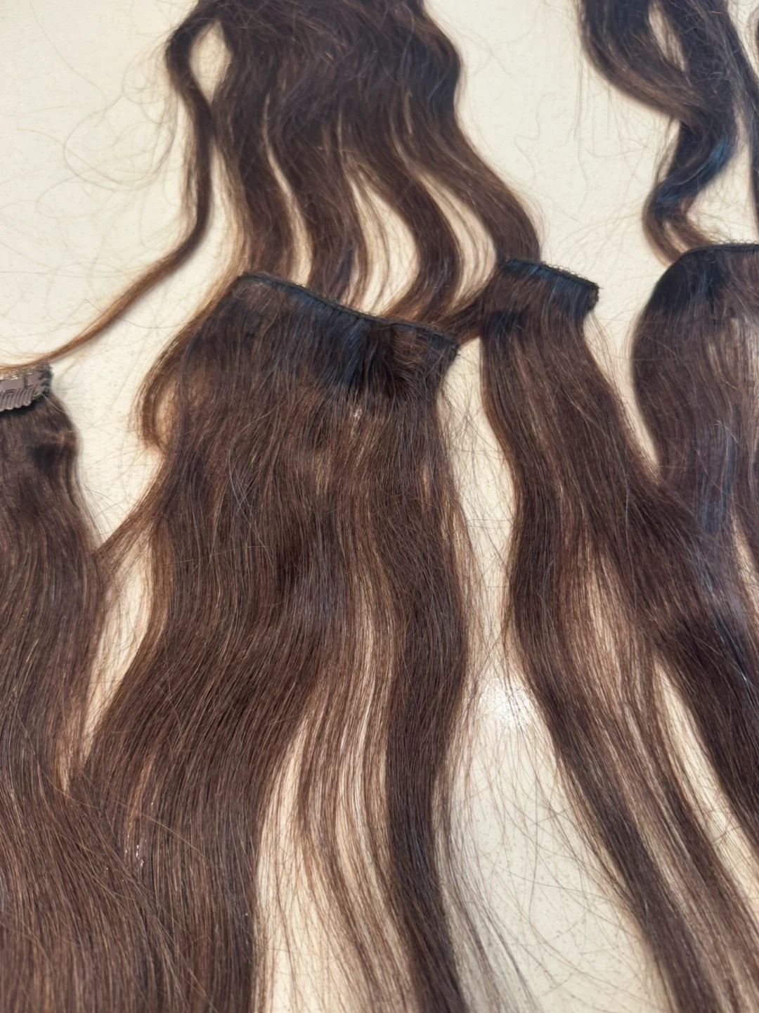 Set of clip-in hair extensions in a natural brown shade. These extensions come with securely attached clips for easy application. Includes a storage bag.