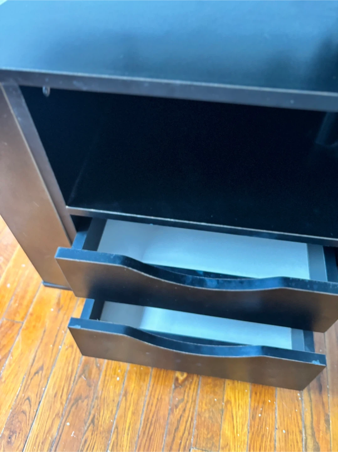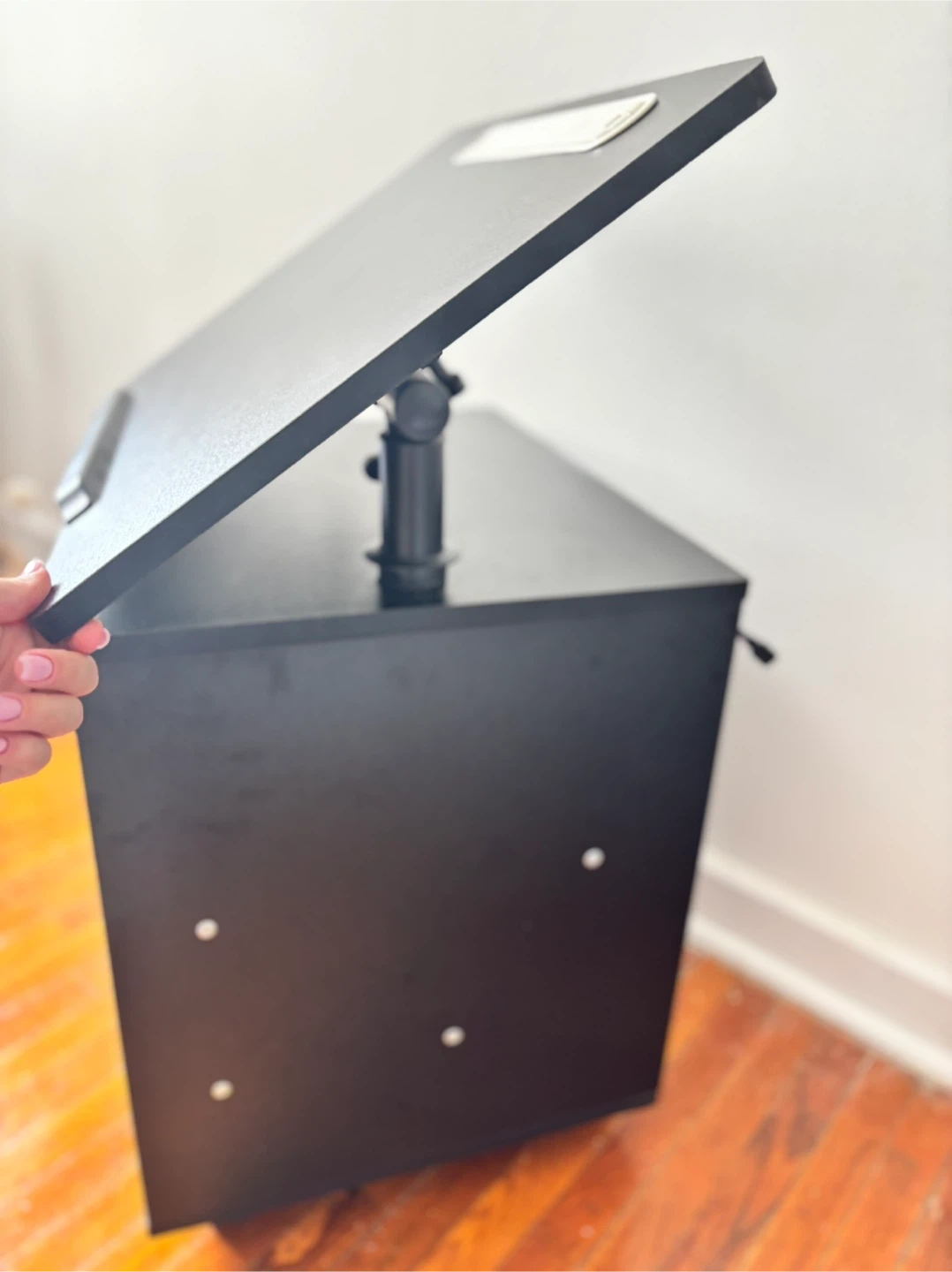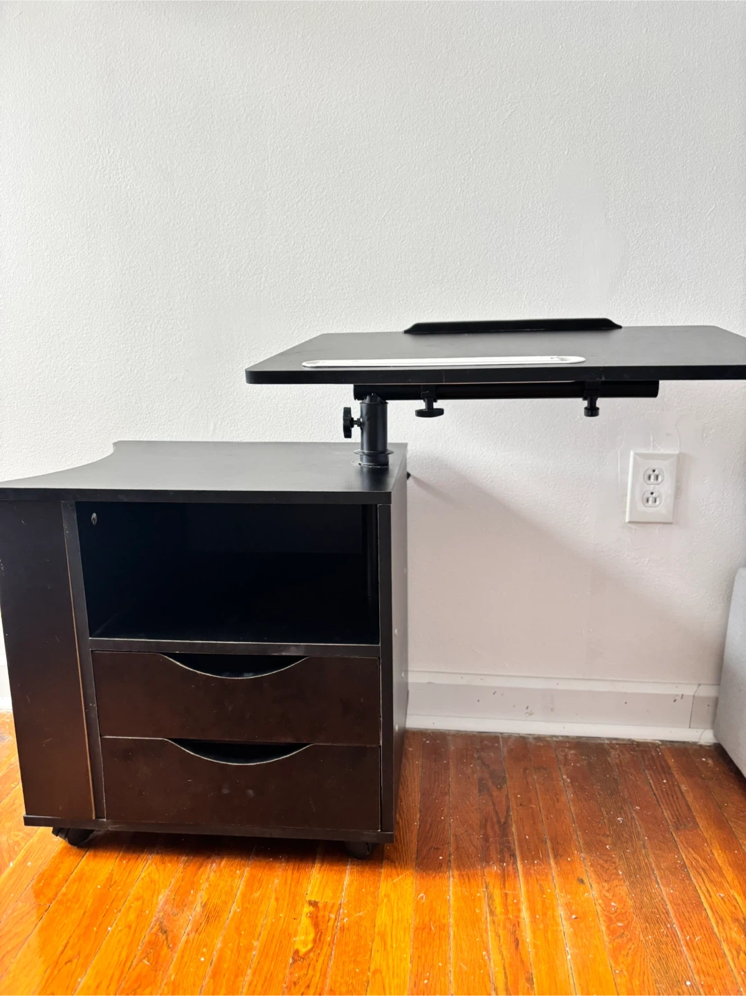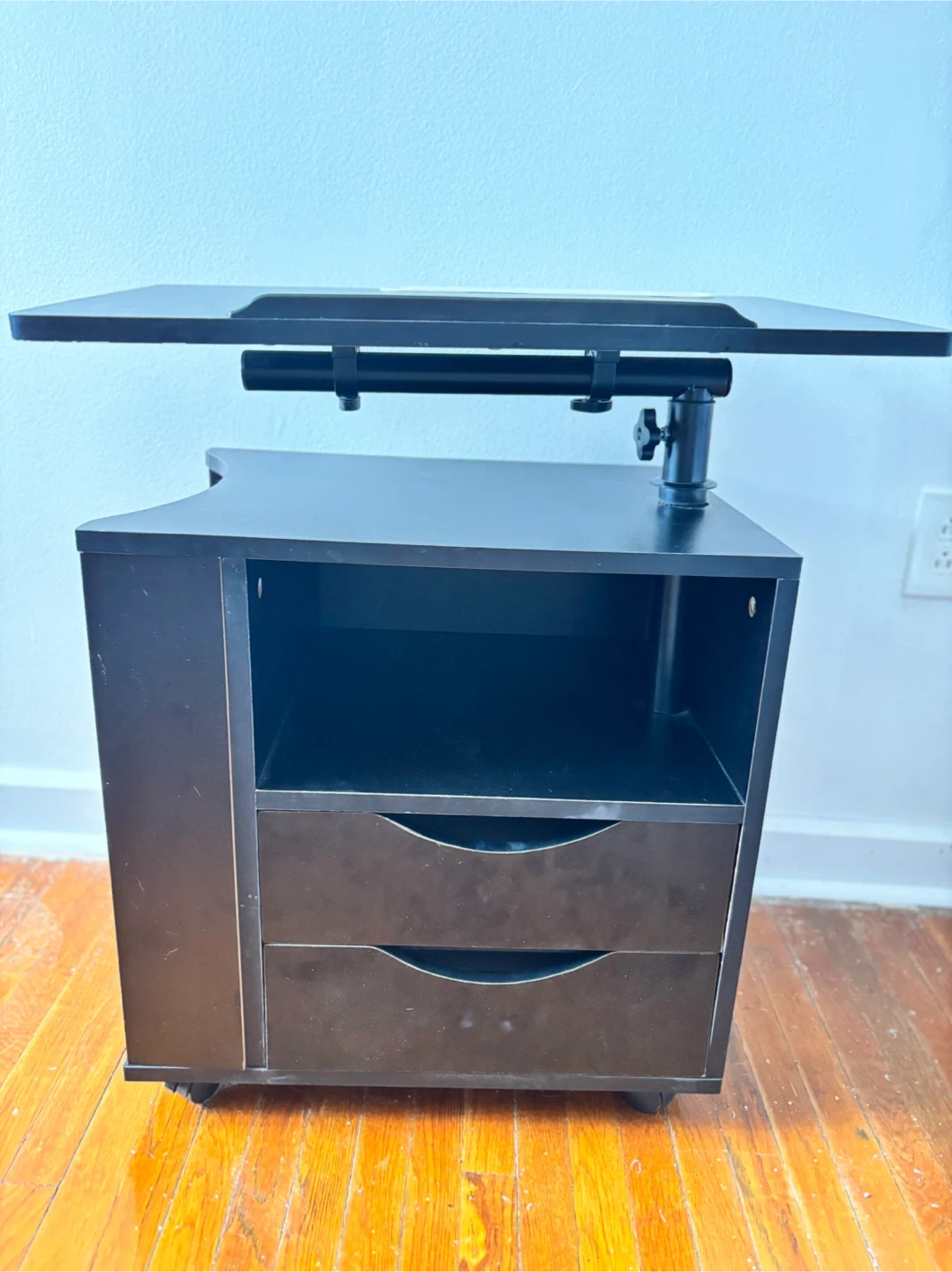 Black rolling nightstand / cabinet in good condition with an adjustable top surface.