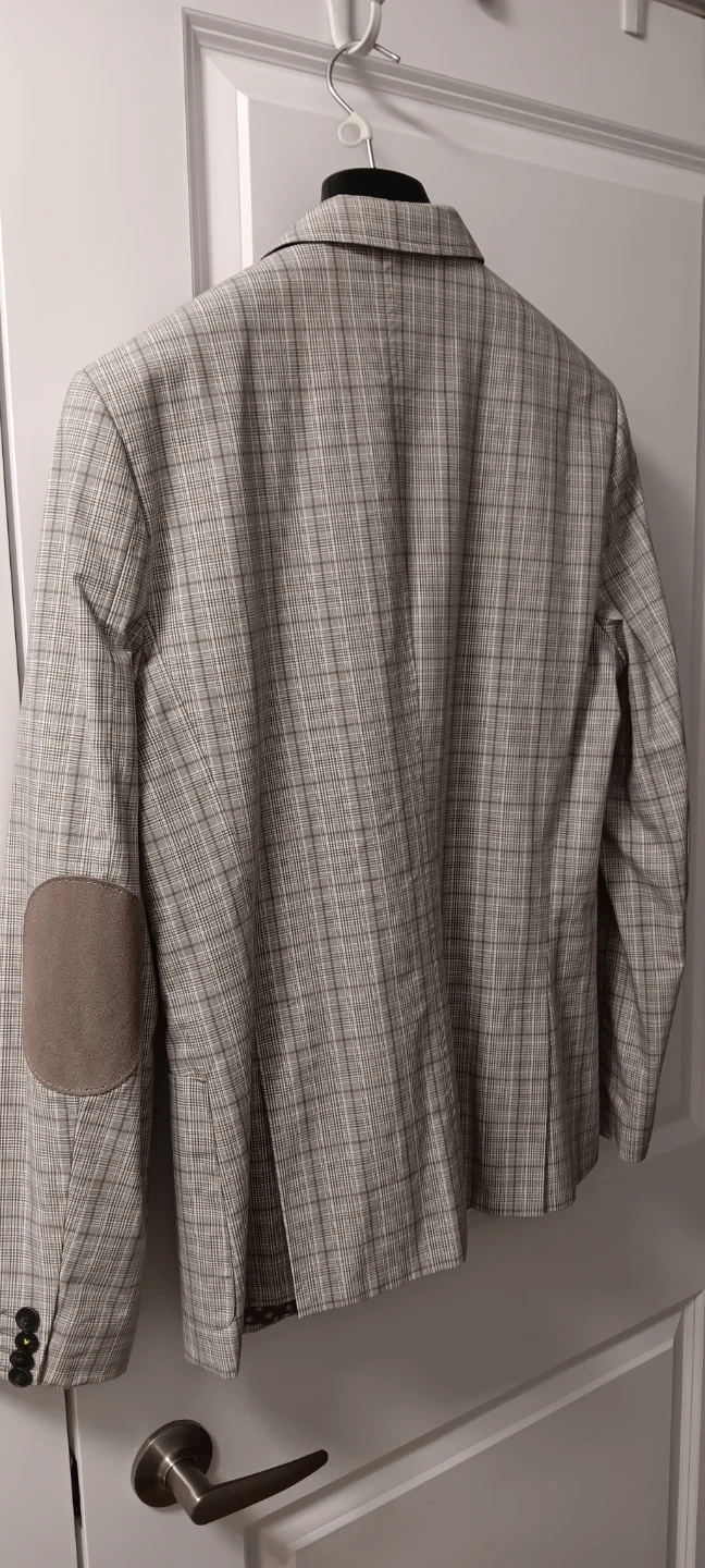 This is an RW&CO. blazer. It's a size medium with a plaid pattern and suede elbow patches. Features a two-button closure. It's great for smart casual occasions.