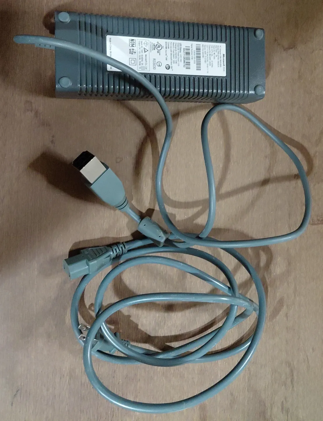 Microsoft Xbox 360 power supply adapter. It's rated for AC 100-240V input and DC 12V output. Includes the power brick and AC cord.