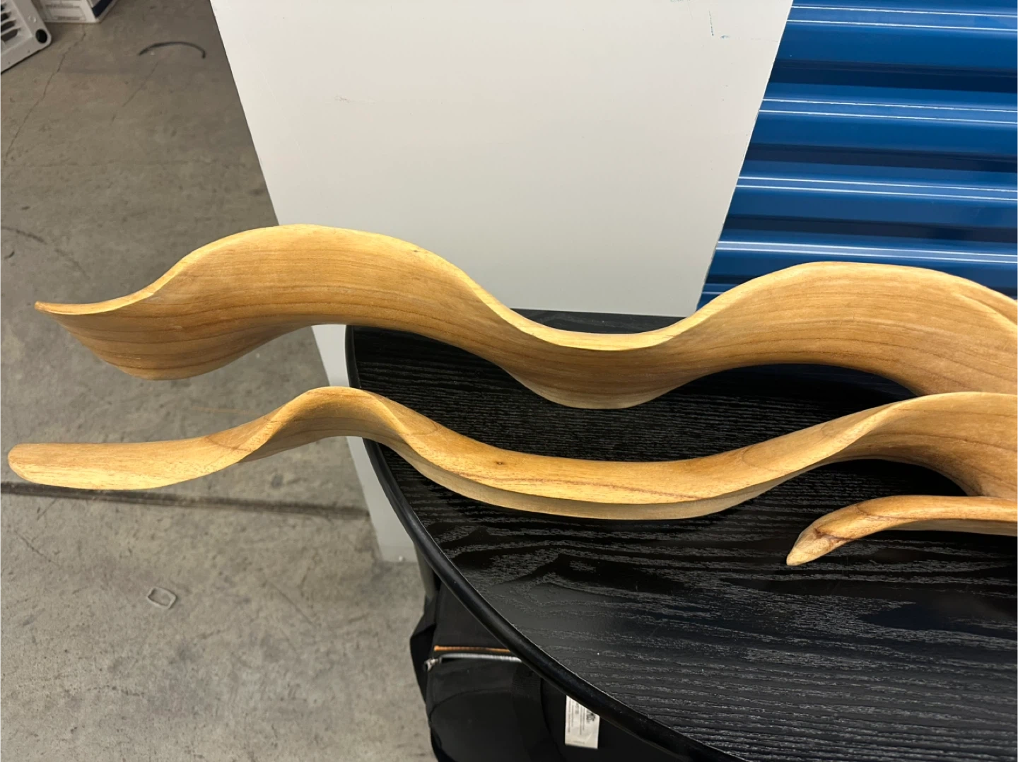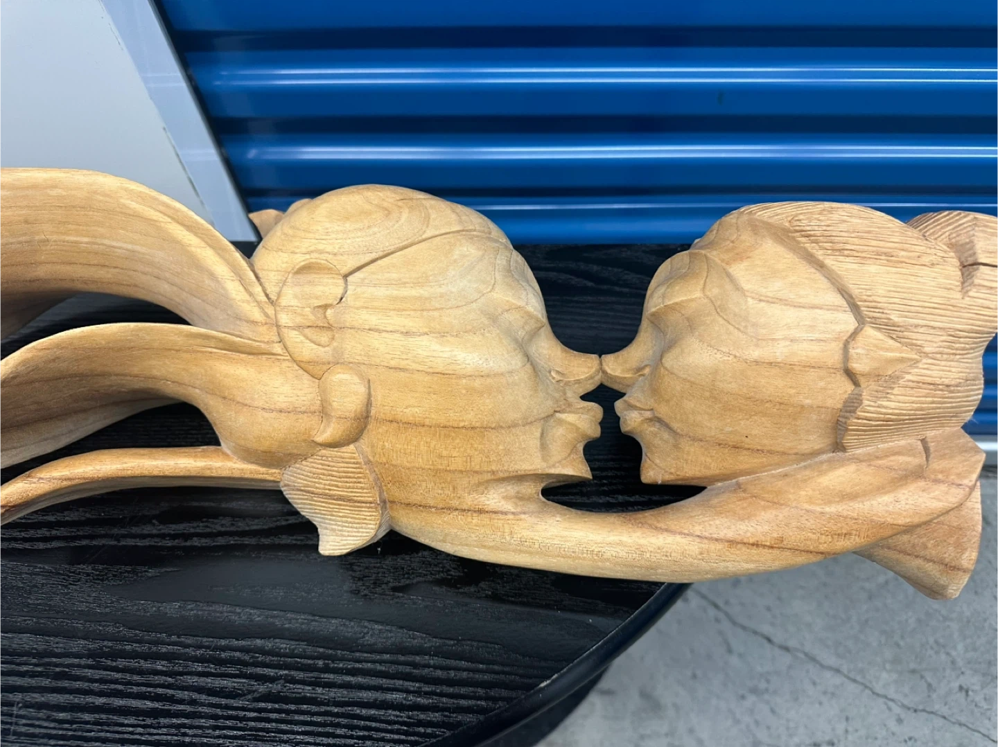 This is a beautiful wooden sculpture depicting two faces leaning in for a kiss. The carving has a smooth finish and shows the natural grain of the wood. It's a striking piece of art that would complement any home decor. Adds an elegant touch to any room!