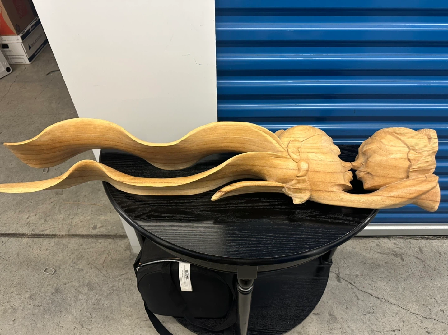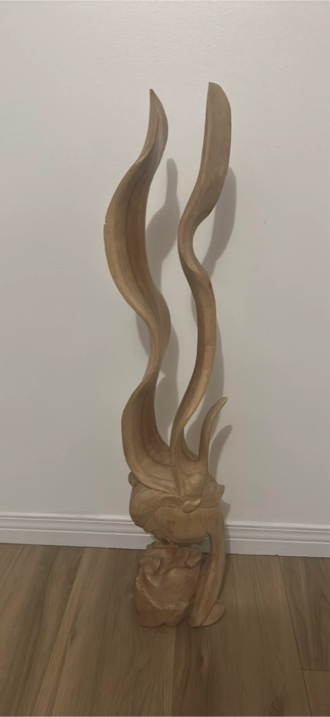 This is a beautiful wooden sculpture depicting two faces leaning in for a kiss. The carving has a smooth finish and shows the natural grain of the wood. It's a striking piece of art that would complement any home decor. Adds an elegant touch to any room!
