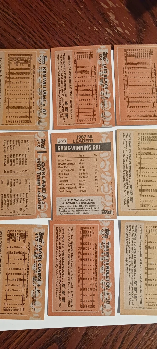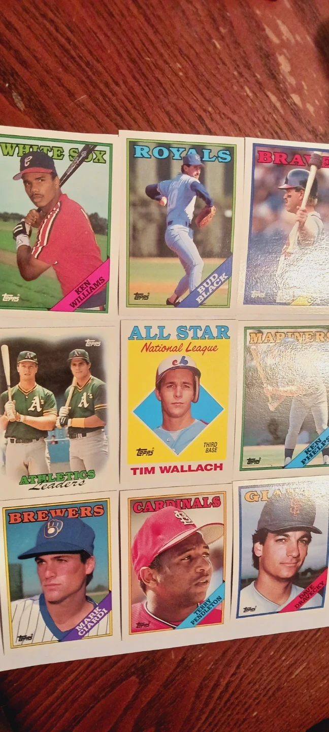 This listing includes a collection of 9× Topps 1988. Major League baseball cards. Featured players include Ken Williams, Bud Black, Tim Wallach, Mark McGwire, and others. Cards are from various teams like the White Sox, Royals, Braves, Athletics, Mariners, Brewers, Cardinals, and Giants. The cards are from the 1988. There are no duplicate cards in this lot. EXCELLENT MINT CONDITION..ALL MY PRICES ARE NEGOTIABLE !!