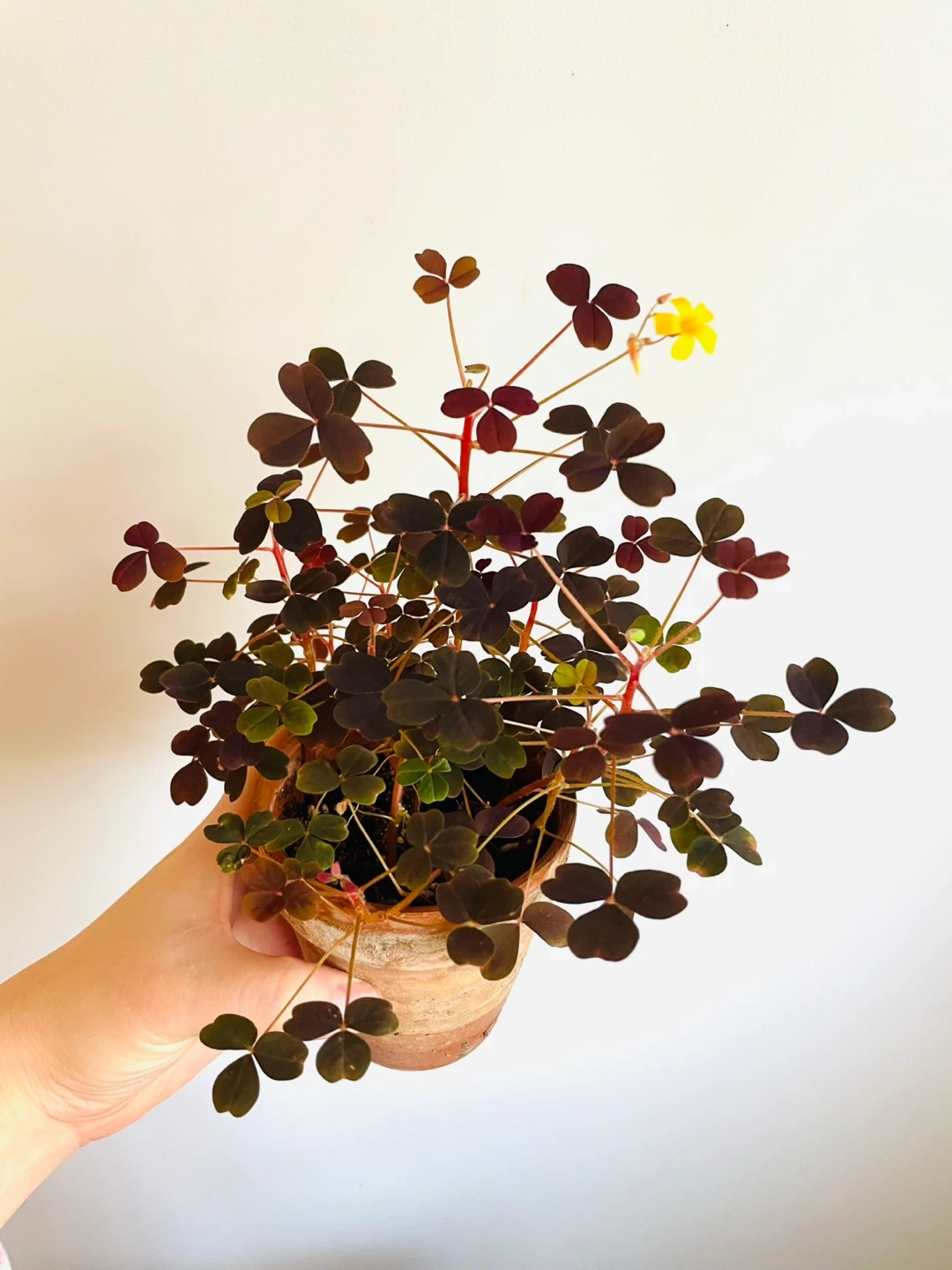 Pretty purple shamrock plant with heart-shaped leaves and a delicate yellow flower. It's currently in a small terracotta pot. This plant adds a lovely touch of colour to any indoor space!