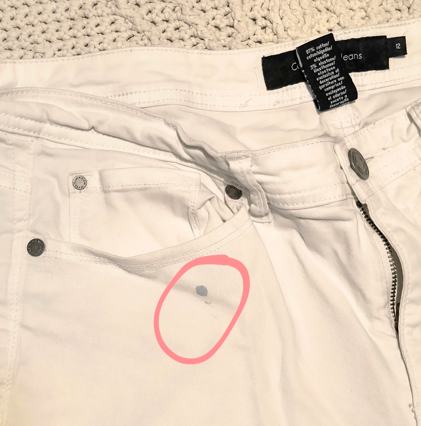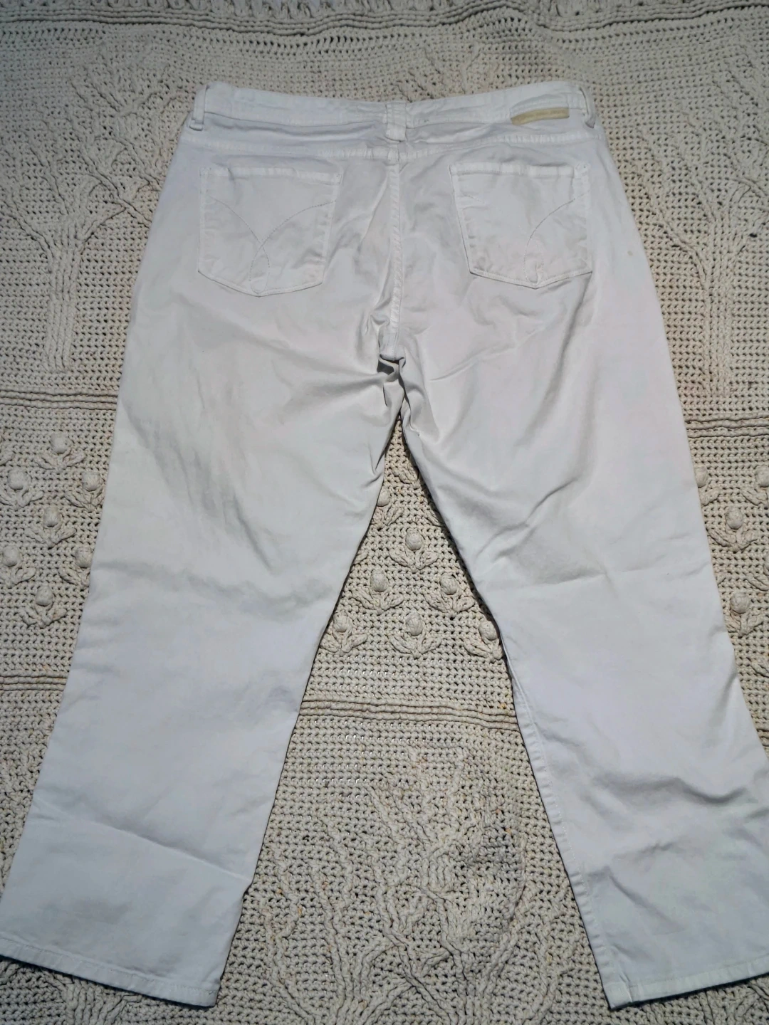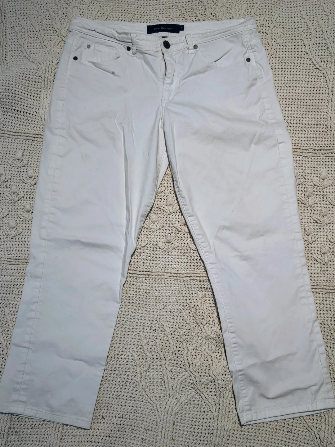 Calvin Klein Jeans white pants. Made of 97% cotton and 3% elastane. Size 12. There's a small grey mark on the front left leg.