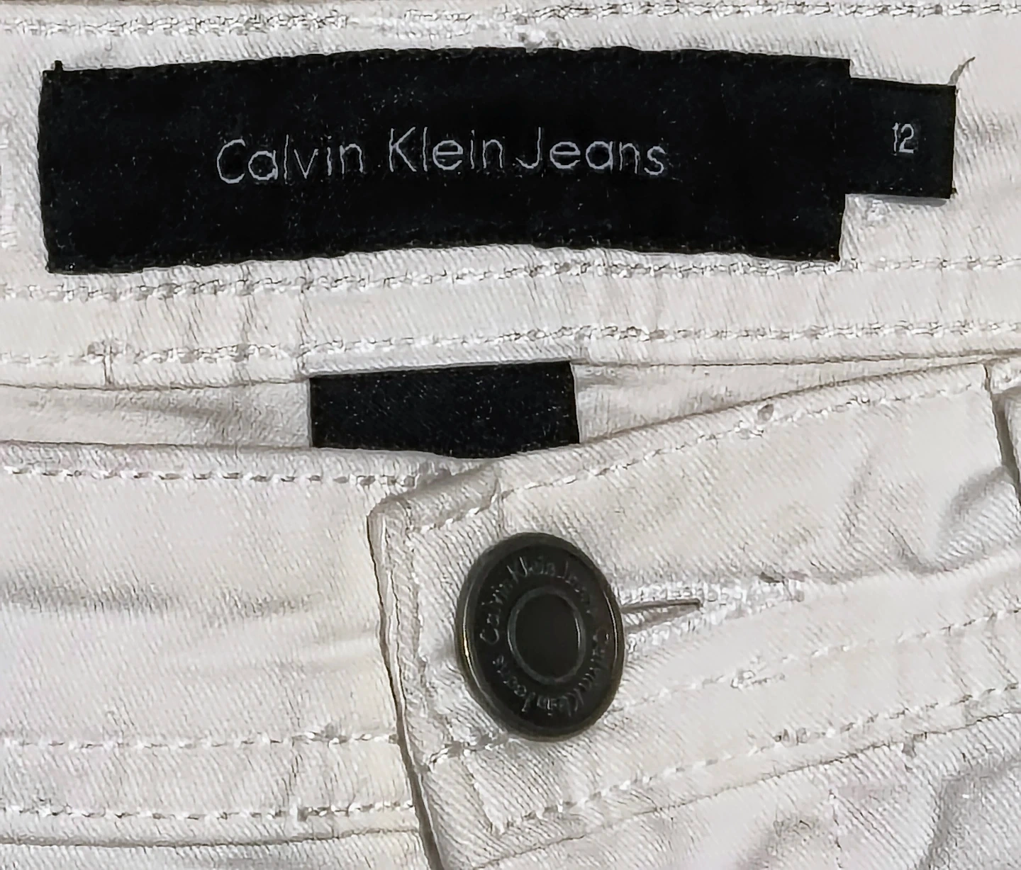 Calvin Klein Jeans white pants. Made of 97% cotton and 3% elastane. Size 12. There's a small grey mark on the front left leg.