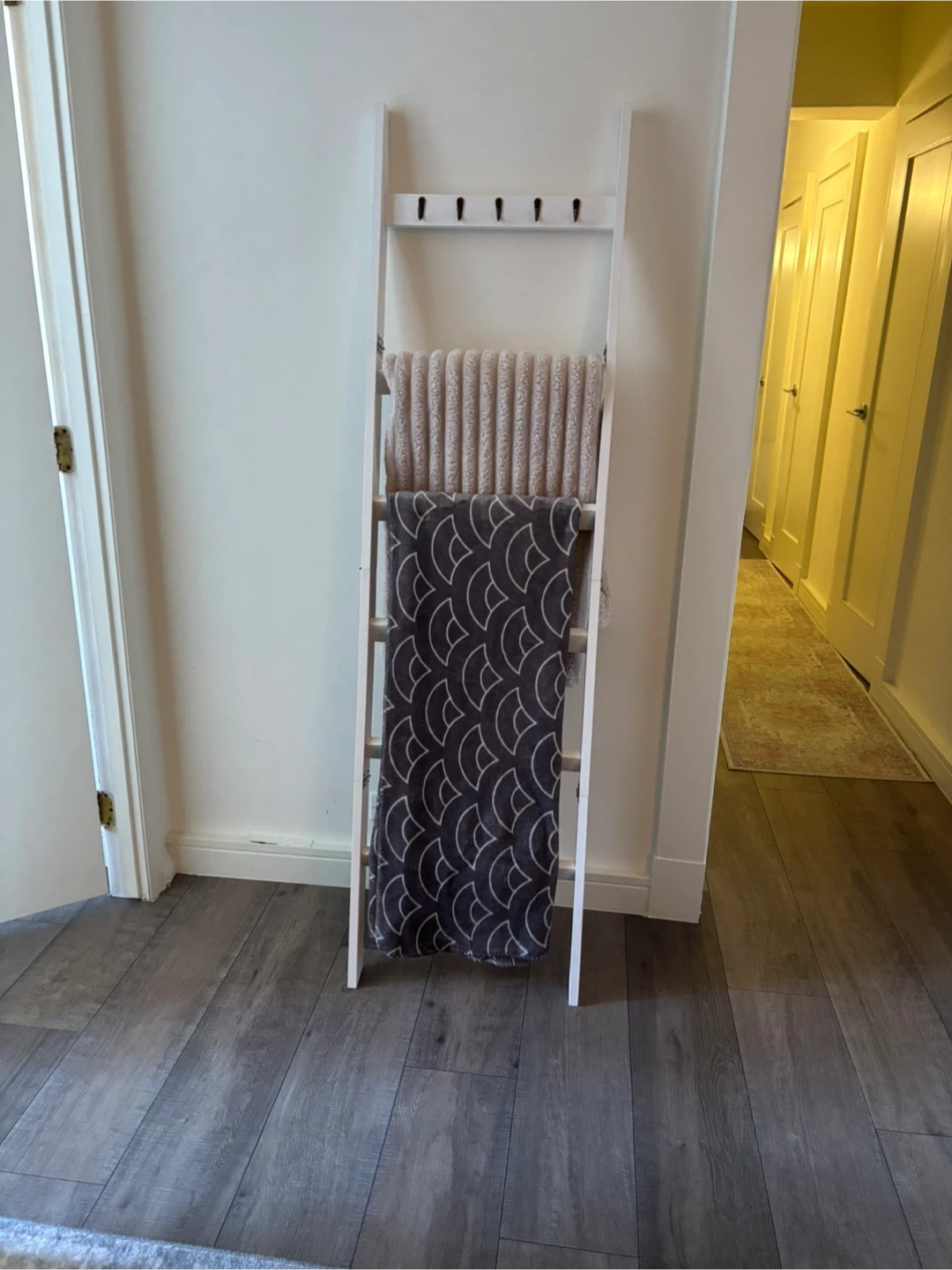 This white ladder rack features several hooks at the top for hanging items. It's perfect for storing blankets or towels. The rack is made of wood and has a clean, modern design.