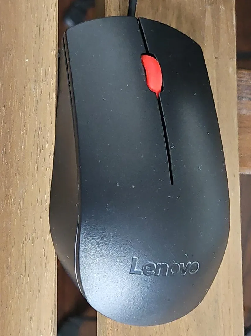 This is a black Lenovo computer mouse. It's a wired mouse with a red scroll wheel. Works great for everyday computer use!