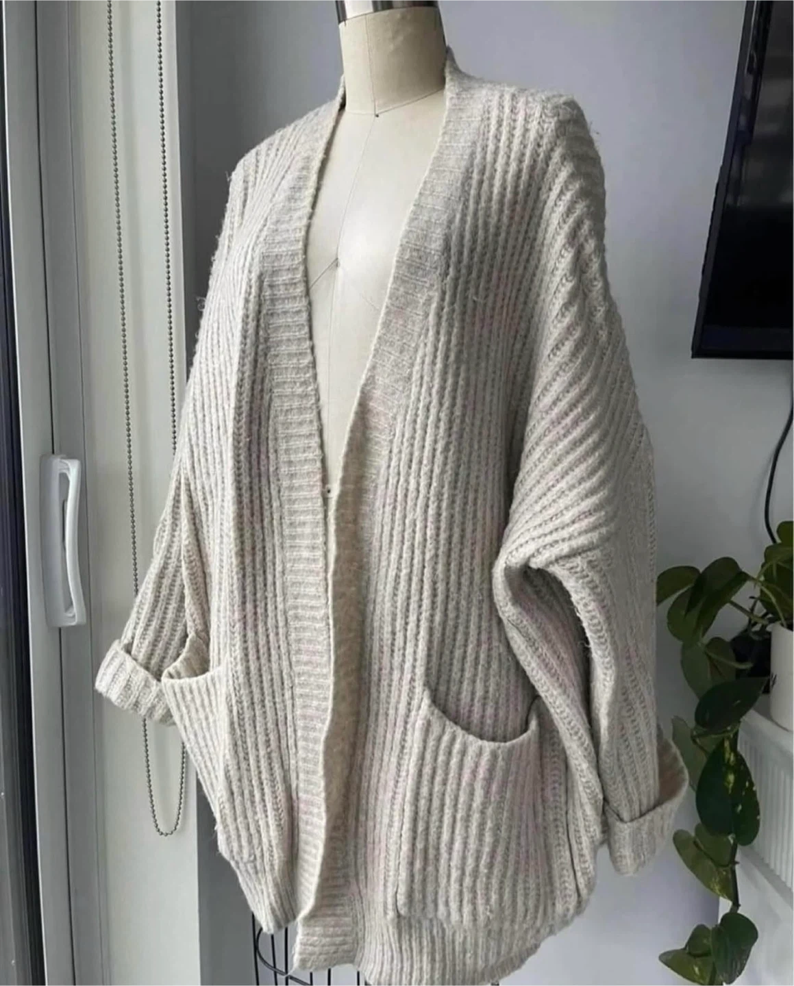 A cozy, cream-coloured cardigan made from a chunky knit material. It features a relaxed fit with two front pockets and a shawl collar. Great for layering over any outfit for extra warmth.