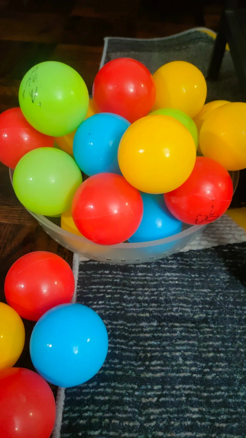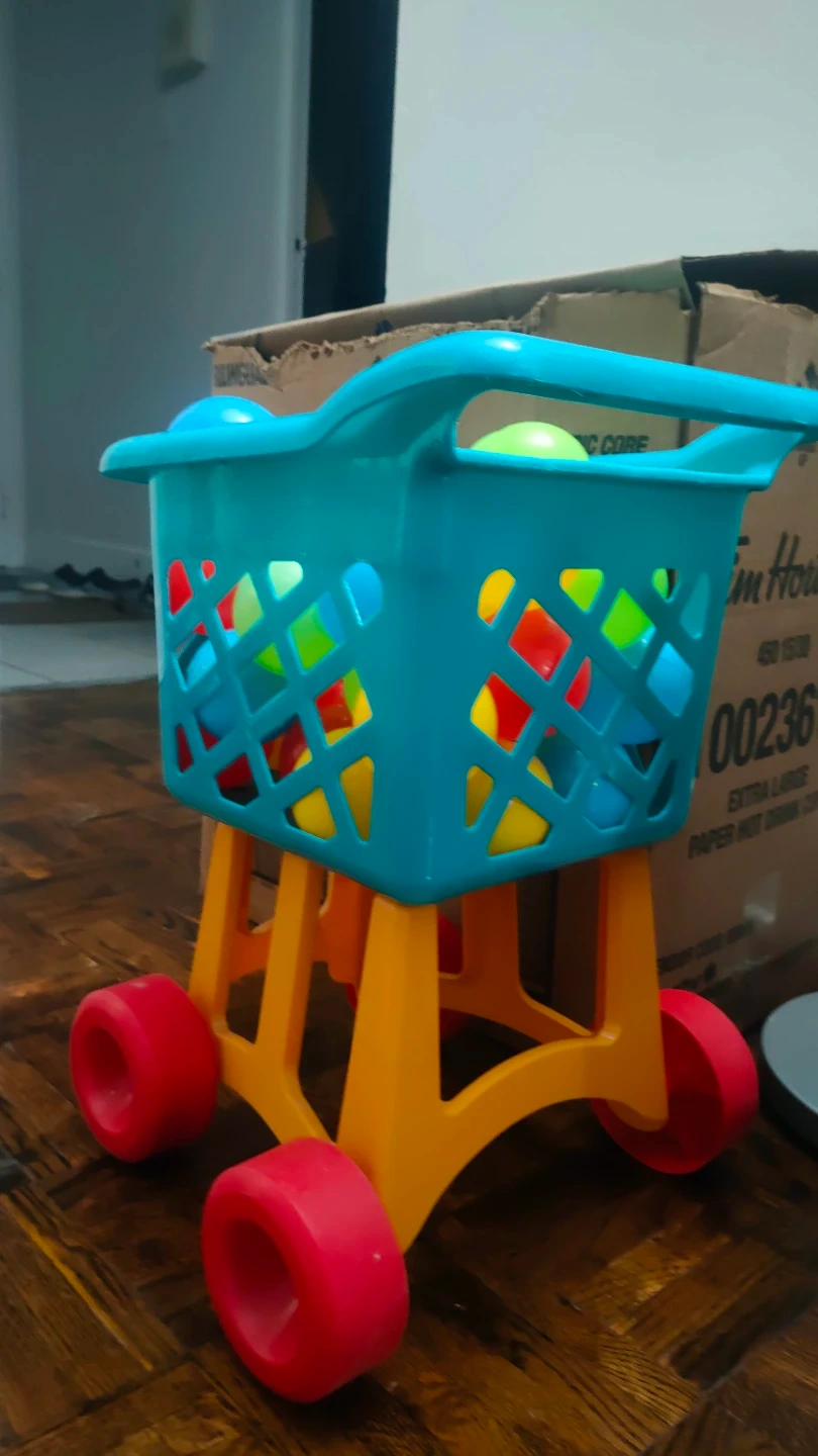 This is a fun play shopping cart for kids, featuring a bright teal basket and orange frame with red wheels. It comes with a collection of colourful plastic balls. Perfect for little ones who love imaginative play!