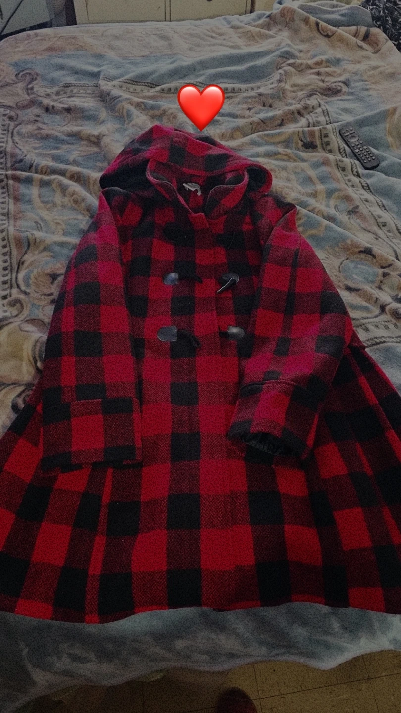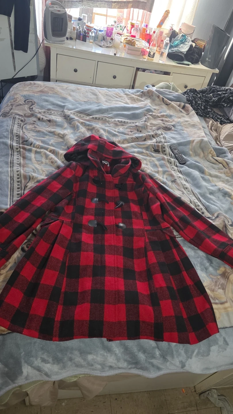 Classic red and black buffalo plaid coat with a hood and toggle closures. It's fully lined for warmth and features a flared hem. This coat is perfect for staying cozy and stylish during cooler weather!