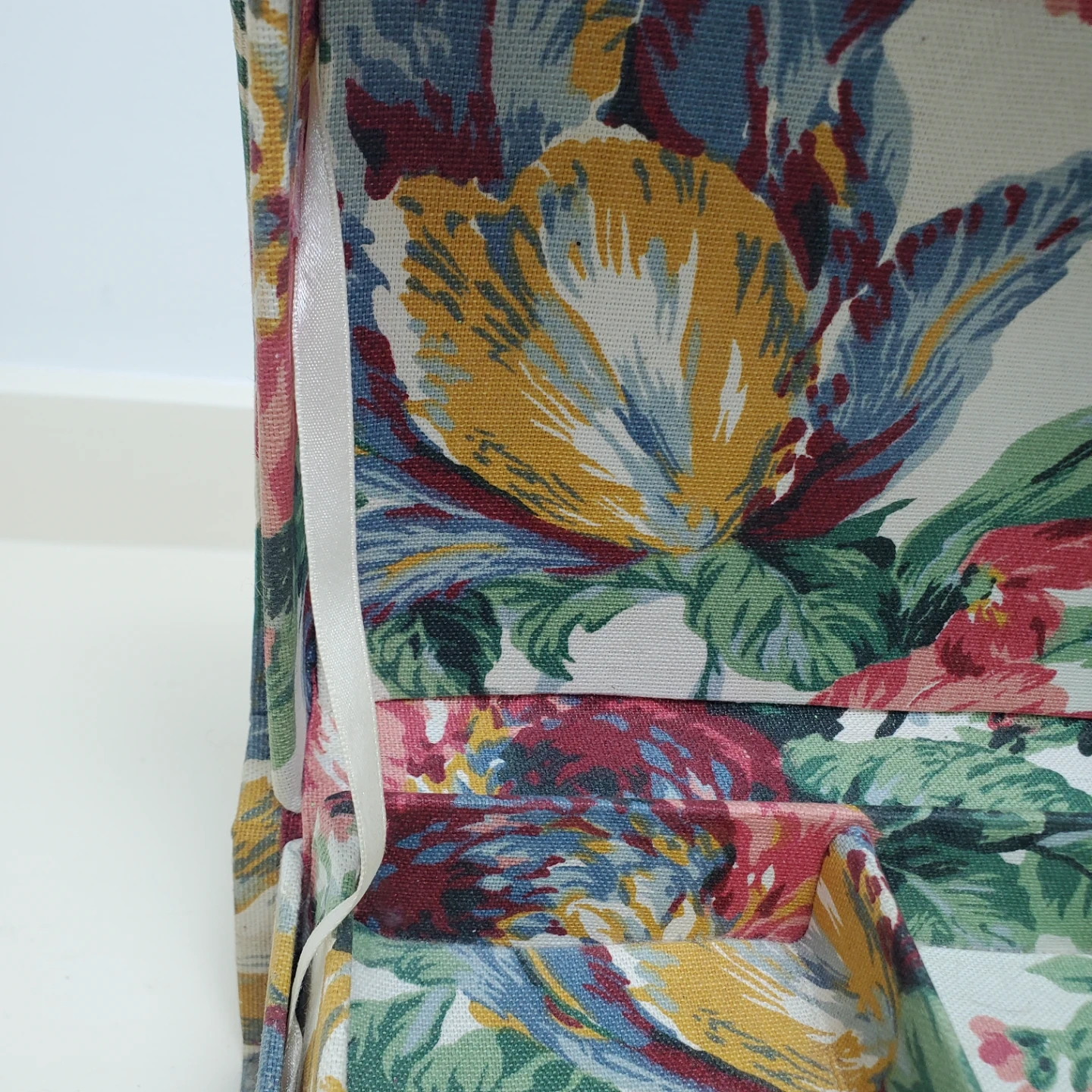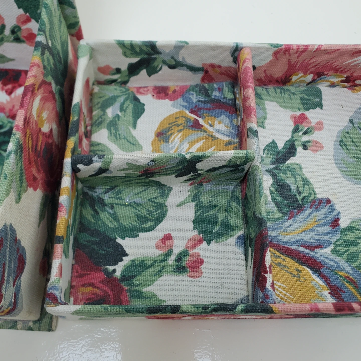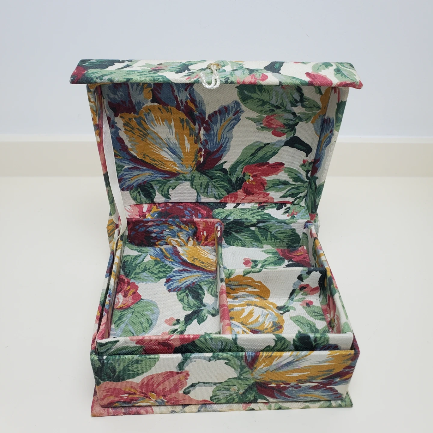 A fabric storage box with a colourful floral pattern. It has multiple compartments inside for organizing small items. The box is hinged and includes a pull string for closure. Missing one ribbon and has signs of use.