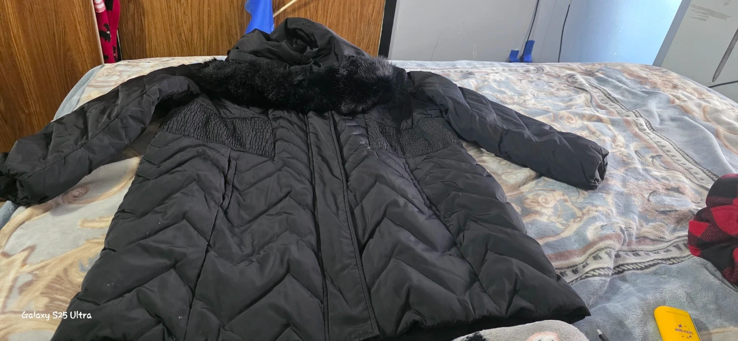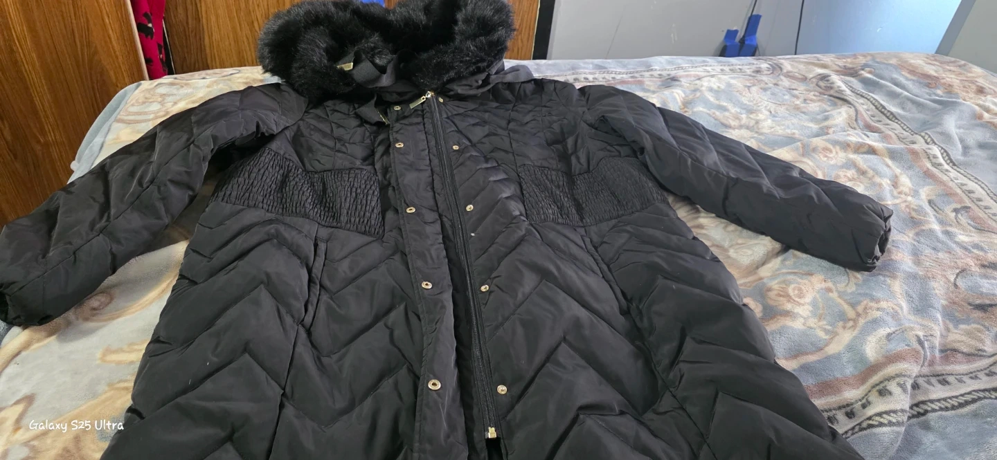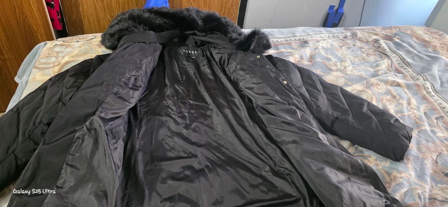 This is a black puffer coat from NUAGE. It features a faux fur-trimmed hood and quilted stitching. The lining is smooth and the exterior is water-resistant. It's perfect for staying warm on cold days!