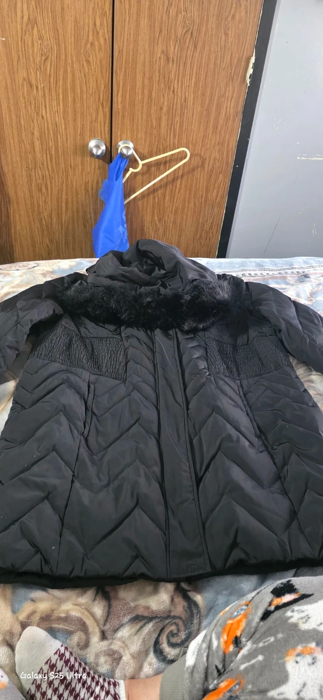 This is a black puffer coat from NUAGE. It features a faux fur-trimmed hood and quilted stitching. The lining is smooth and the exterior is water-resistant. It's perfect for staying warm on cold days!