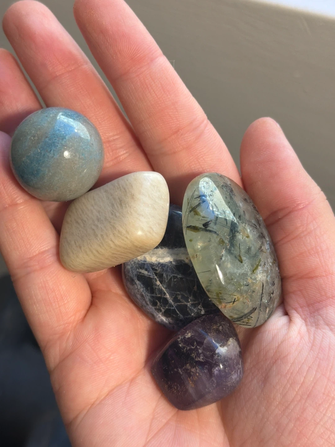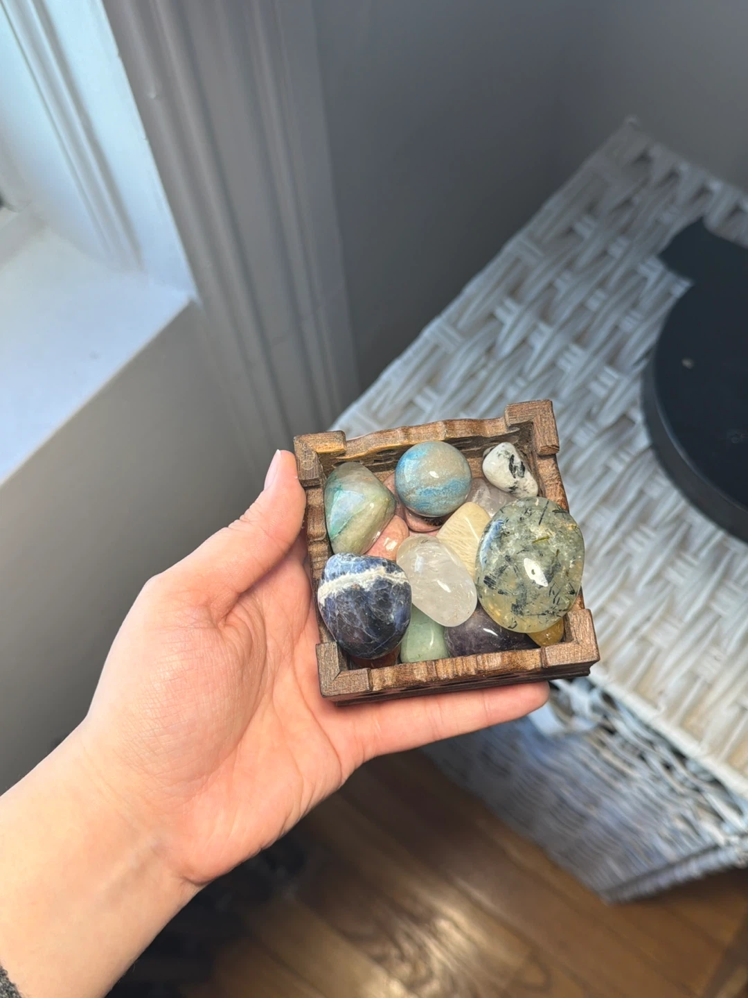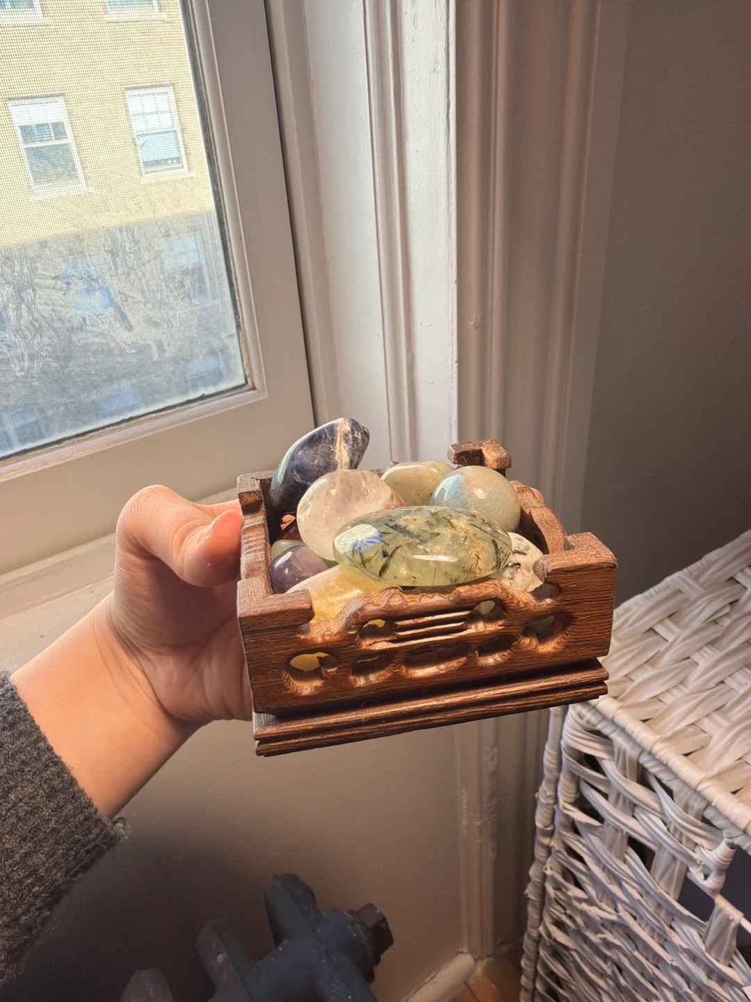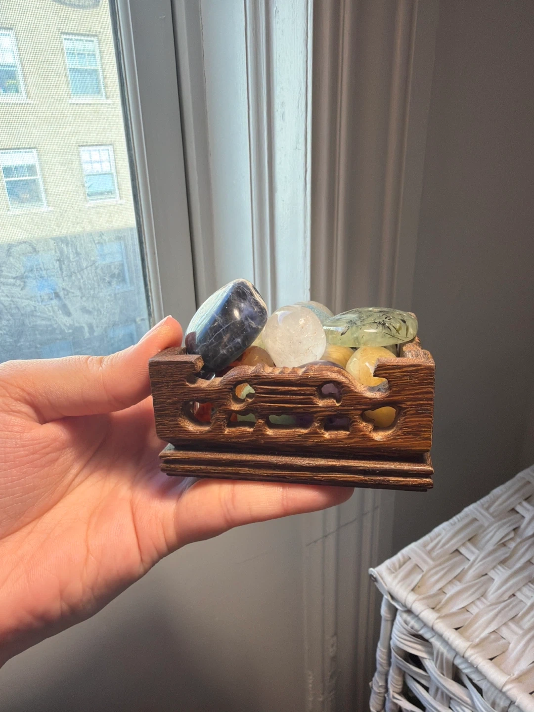 Small, intricately carved wooden box filled with various polished gemstones. The wood has a dark, rich finish and features detailed scrollwork on its sides.