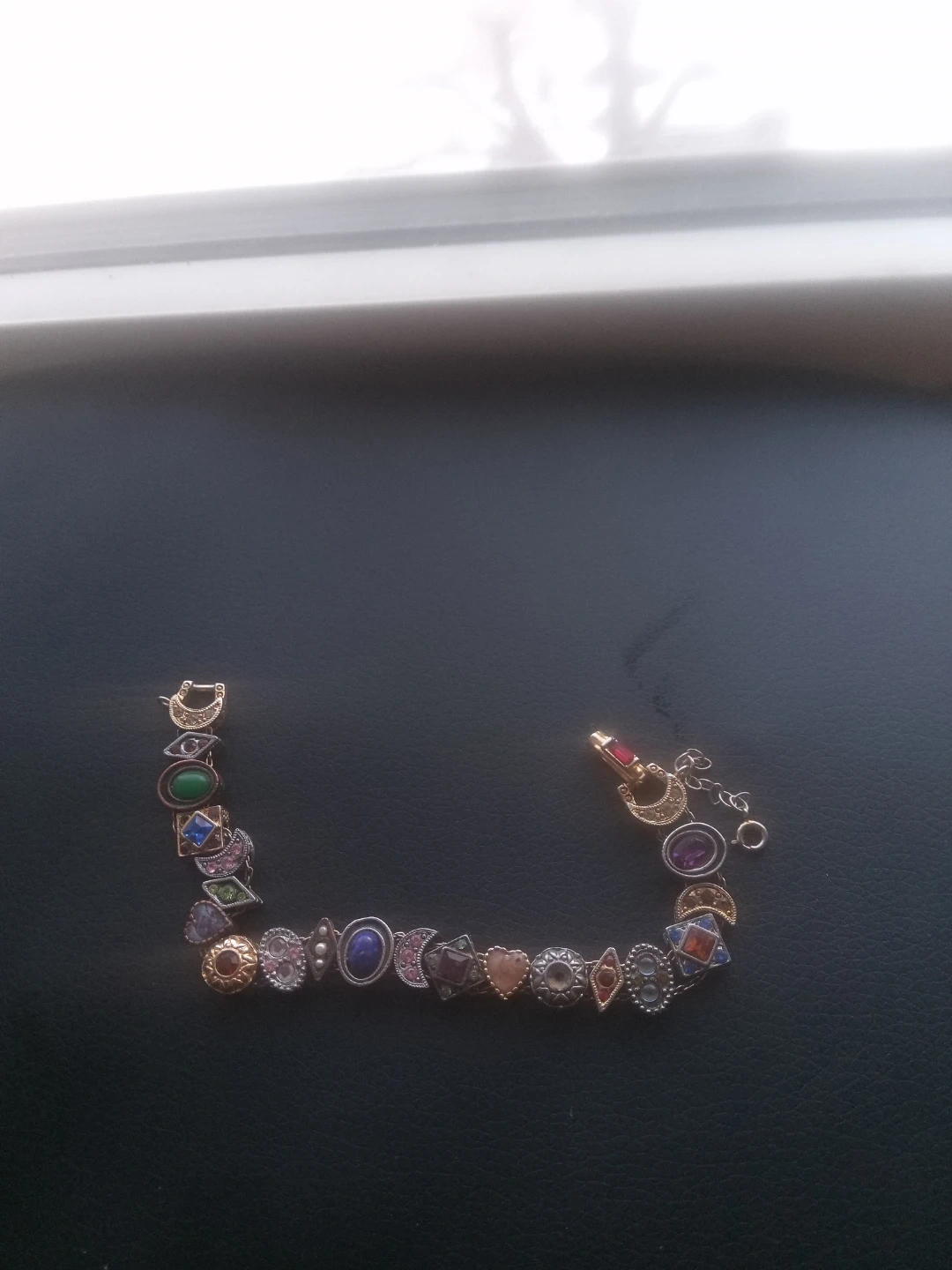 This charm bracelet features a variety of decorative charms, including moons, hearts, and colored gemstones. It has a secure clasp closure. The bracelet is adjustable in length.