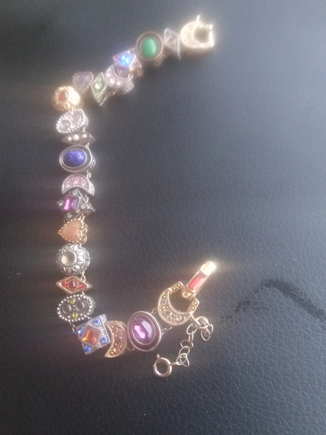 This charm bracelet features a variety of decorative charms, including moons, hearts, and colored gemstones. It has a secure clasp closure. The bracelet is adjustable in length.