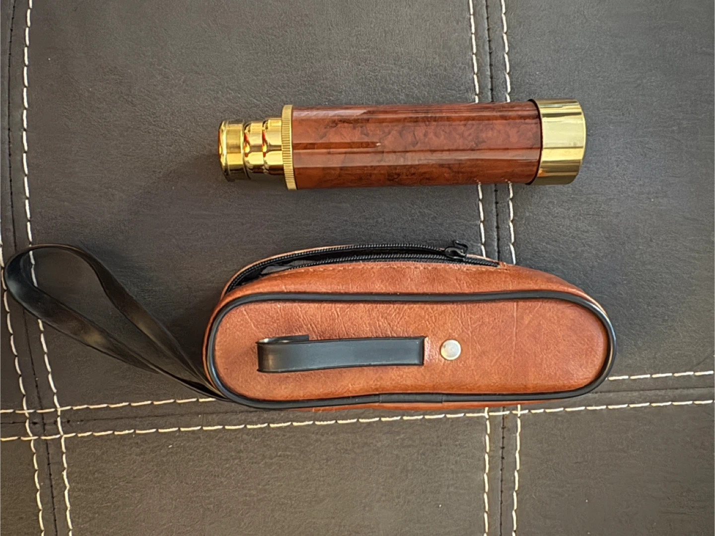 This is a functioning brass telescope with a wooden-look finish. It comes with a brown faux leather carrying case with a strap. Perfect for your inner pirate or adventurer. It’s in great condition.